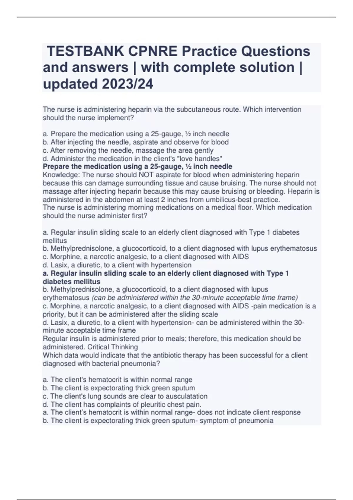 TESTBANK CPNRE Practice Questions and answers | with complete solution | updated 2023/24