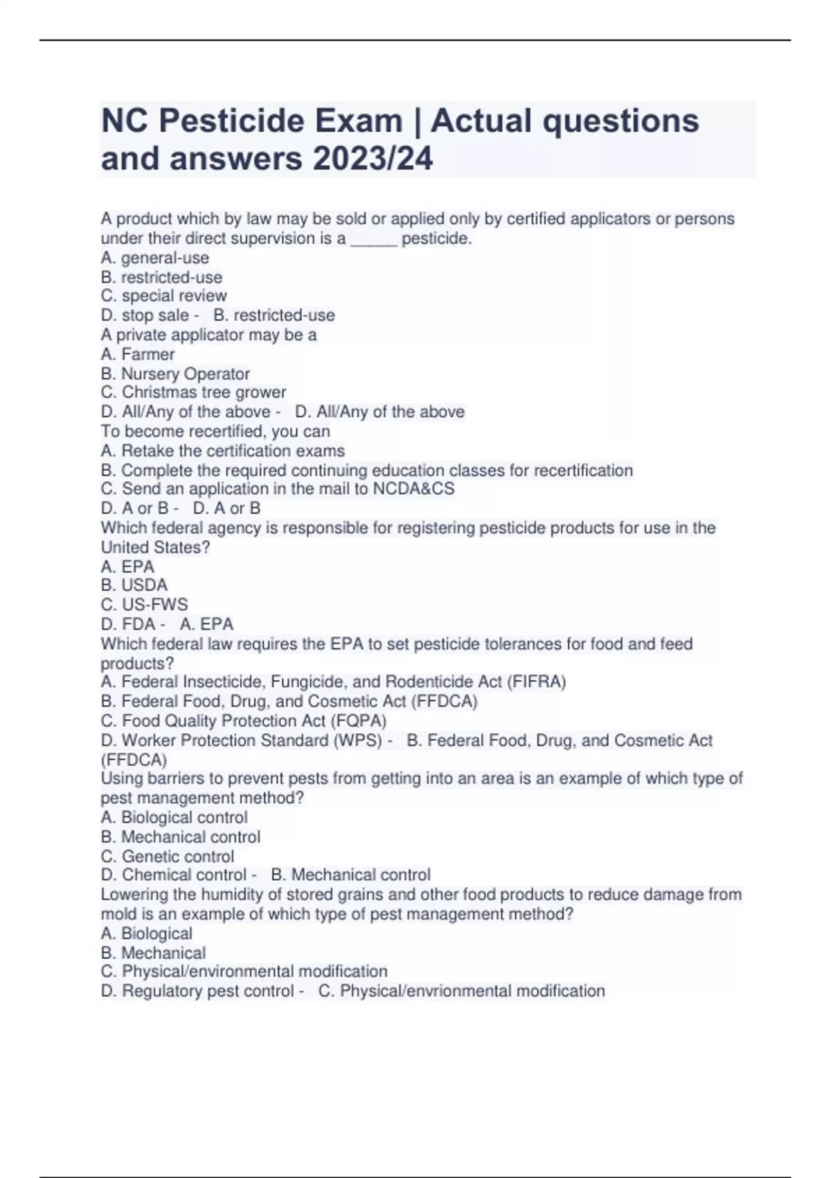 NC Pesticide Exam | Actual questions and answers 2023/24
