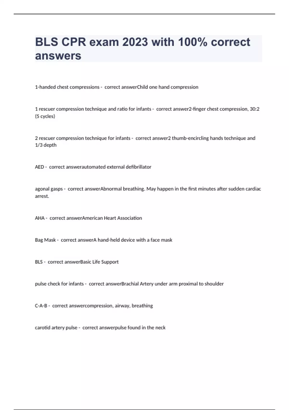 1-handed chest compressions - correct answerChild one hand compression 1 rescuer compression technique and ratio for infants - correct answer2-finger chest compression, 30:2 (5 cycles) 2 rescuer compression technique for infants - correct answer2 thumb-encircling hands technique and 1/3 depth AED - correct answerautomated external defibrillator agonal gasps - correct answerAbnormal breathing. May happen in the first minutes after sudden cardiac arrest. AHA - correct answerAmerican Heart Association Bag Mask - correct answerA hand-held device with a face mask BLS - correct answerBasic Life Support pulse check for infants - correct answerBrachial Artery under arm proximal to shoulder C-A-B - correct answercompression, airway, breathing carotid artery pulse - correct answerpulse found in the neck