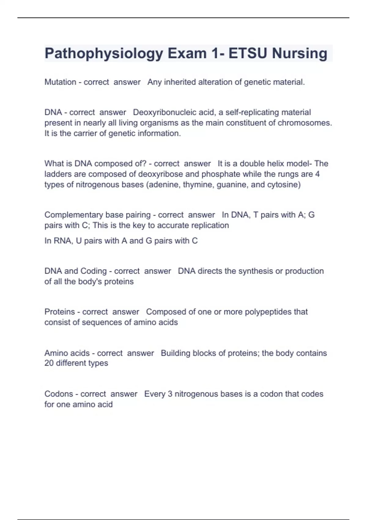 Pathophysiology Exam 1 Question and answers correctly solved 2023/2024Mutation - correct answer Any inherited alteration of genetic material. DNA - correct answer Deoxyribonucleic acid, a self-replicating material present in nearly all living organisms as the main constituent of chromosomes. It is the carrier of genetic information. What is DNA composed of? - correct answer It is a double helix model- The ladders are composed of deoxyribose and phosphate while the rungs are 4 types of nitrogenous bases (adenine, thymine, guanine, and cytosine) Complementary base pairing - correct answer In DNA, T pairs with A; G pairs with C; This is the key to accurate replication In RNA, U pairs with A and G pairs with C DNA and Coding - correct answer DNA directs the synthesis or production of all the body's proteins