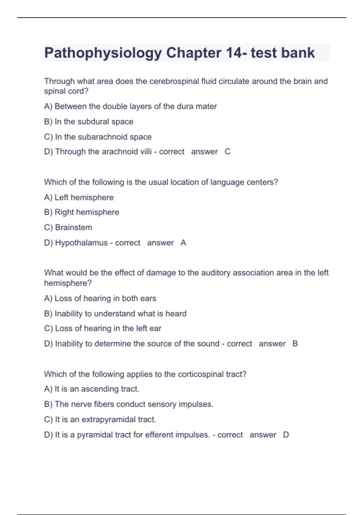 Pathophysiology Chapter 14 Questions with complete solution 2023/2024Through what area does the cerebrospinal fluid circulate around the brain and spinal cord? A) Between the double layers of the dura mater B) In the subdural space C) In the subarachnoid space D) Through the arachnoid villi - correct answer C Which of the following is the usual location of language centers? A) Left hemisphere B) Right hemisphere C) Brainstem D) Hypothalamus - correct answer A What would be the effect of damage to the auditory association area in the left hemisphere? A) Loss of hearing in both ears B) Inability to understand what is heard C) Loss of hearing in the left ear D) Inability to determine the source of the sound - correct answer B Which of the following applies to the corticospinal tract? A) It is an ascending tract. B) The nerve fibers conduct sensory impulses. C) It is an extrapyramidal tract. D) It is a pyramidal