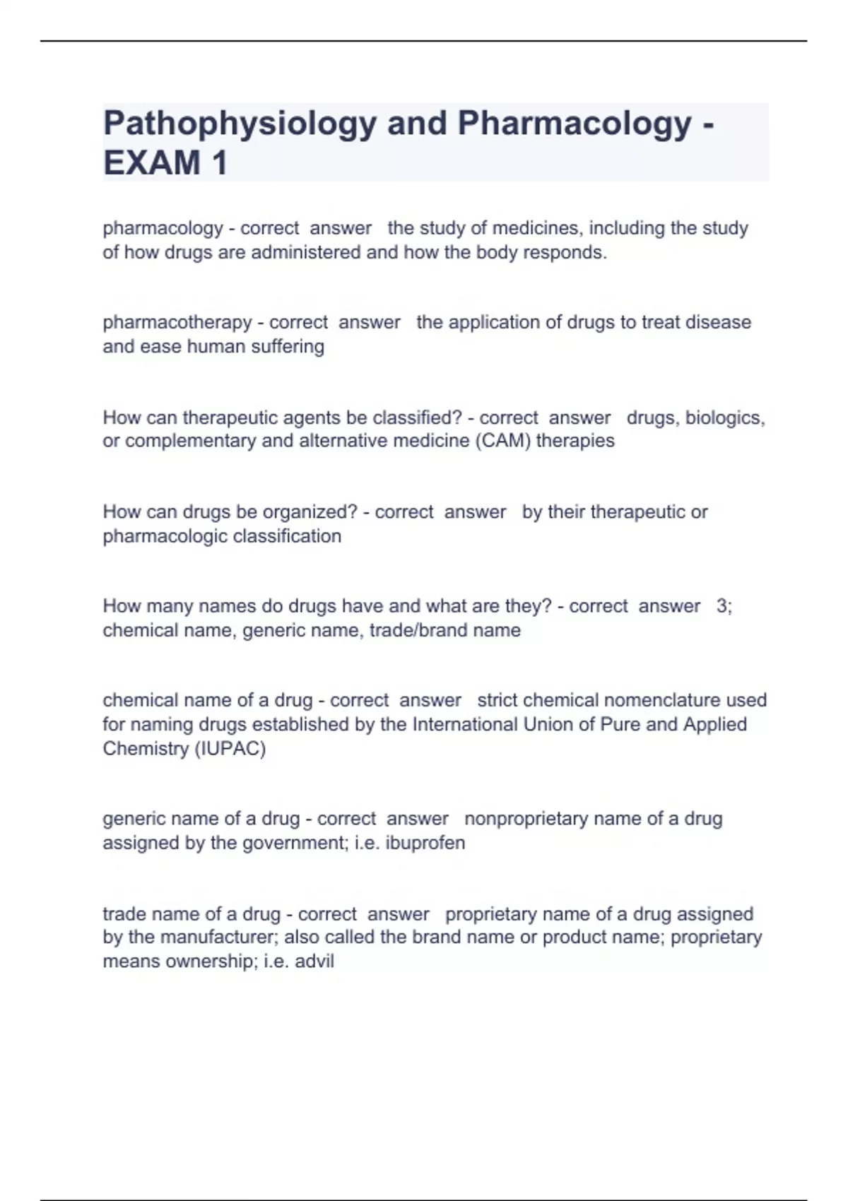 Pathophysiology and Pharmacology Question and answers 100% correct 2023/2024pharmacology - correct answer the study of medicines, including the study of how drugs are administered and how the body responds. pharmacotherapy - correct answer the application of drugs to treat disease and ease human suffering How can therapeutic agents be classified? - correct answer drugs, biologics, or complementary and alternative medicine (CAM) therapies How can drugs be organized? - correct answer by their therapeutic or pharmacologic classification How many names do drugs have and what are they? - correct answer 3; chemical name, generic name, trade/brand name