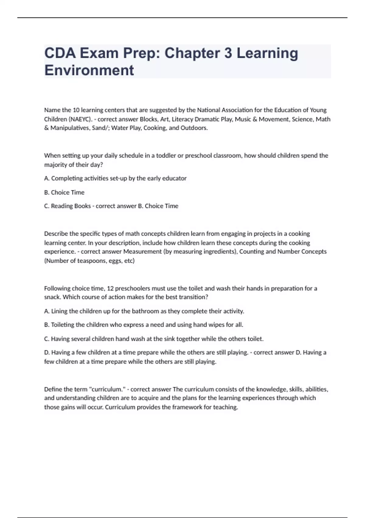 CDA Exam Prep Chapter 3 Learning EnvironmentName the 10 learning centers that are suggested by the National Association for the Education of Young Children (NAEYC). - correct answer Blocks, Art, Literacy Dramatic Play, Music & Movement, Science, Math & Manipulatives, Sand/; Water Play, Cooking, and Outdoors. When setting up your daily schedule in a toddler or preschool classroom, how should children spend the majority of their day? A. Completing activities set-up by the early educator B. Choice Time C. Reading Books - correct answer B. Choice Time Describe the specific types of math concepts children learn from engaging in projects in a cooking learning center. In your description, include how children learn these concepts during the cooking experience. - correct answer Measurement (by measuring ingredients), Counting and Number Concepts (Number of teaspoons, eggs, etc) Following choice time, 12 preschoolers must use the toilet and wash their hands in preparation for a snack. Which course of action makes for the best transition? A. Lining the children up for the bathroom as they complete their activity. B. Toileting the children who express a need and using hand wipes for all. C. Having several children hand wash at the sink together while the others toilet. D. Having a few children at a time prepare while the others are still playing. - correct answer D. Having a few children at a time prepare while the others are still playing. Define the term "curriculum." - correct answer The curriculum consists of the knowledge, skills, abilities, and understanding children are to acquire and the plans for the learning experiences through which those gains will occur. Curriculum provides the framework for teaching. Define "quality" curriculum for young children. - correct answer Developmentally appropriate curriculum for young children; Encourages creativity and provides open-ended opportunities for young children; child-centered and responsive to children's engagement and needs; recognizes children, their families, their cultures and languages and appreciates individual differences; provides real, hands-on experiences; children spend more time doing and learning versus watching; views every minute of the day as a learning opportunity, etc.