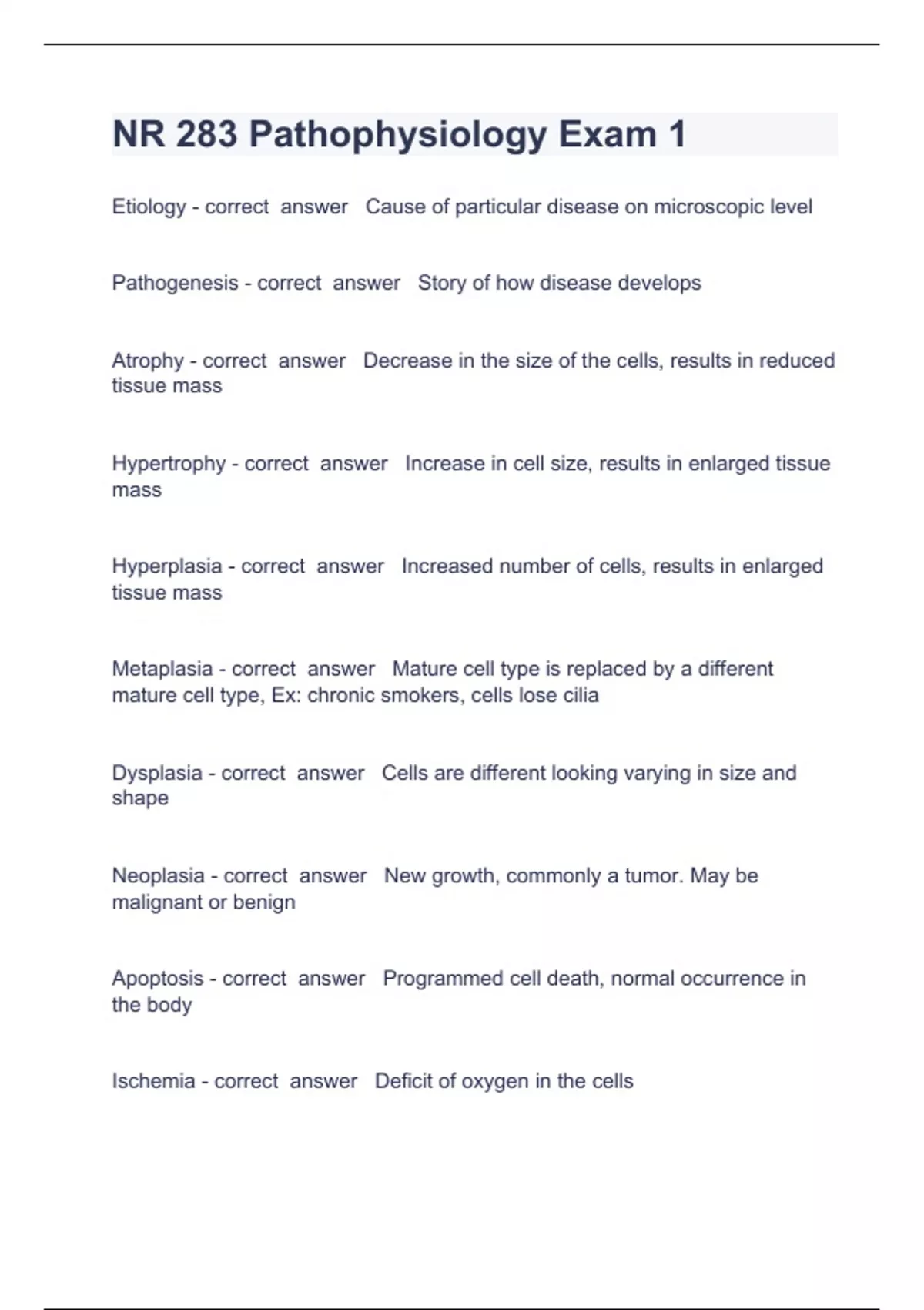 NR 283 Pathophysiology Exam 1 Questions with complete solution 2023/2024Etiology - correct answer Cause of particular disease on microscopic level Pathogenesis - correct answer Story of how disease develops Atrophy - correct answer Decrease in the size of the cells, results in reduced tissue mass Hypertrophy - correct answer Increase in cell size, results in enlarged tissue mass Hyperplasia - correct answer Increased number of cells, results in enlarged tissue mass Metaplasia - correct answer Mature cell type is replaced by a different mature cell type, Ex: chro