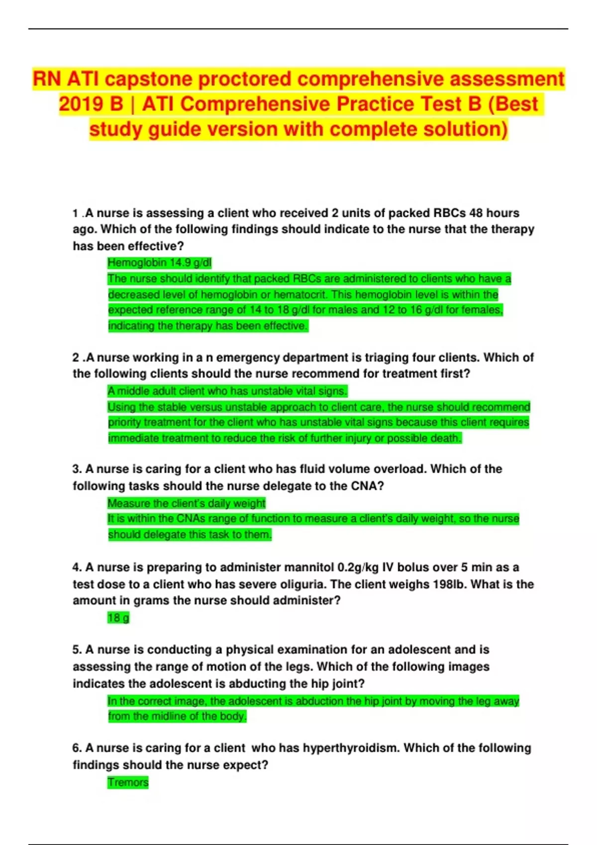 RN ATI capstone proctored comprehensive assessment 2019 B | ATI Comprehensive Practice Test B (Best study guide version with complete solution) 1 .A nurse is assessing a client who received 2 units of packed RBCs 48 hours ago. Which of the following findings should indicate to the nurse that the therapy has been effective? Hemoglobin 14.9 g/dl The nurse should identify that packed RBCs are administered to clients who have a decreased level of hemoglobin or hematocrit. This hemoglobin level is within the expected reference range of 14 to 18 g/dl for males and 12 to 16 g/dl for females, 2 .A nurse working in a n emergency department is triaging four clients. Which of the following clients should the nurse recommend for treatment first? A middle adult client who has unstable vital signs. Using the stable versus unstable approach to client care, the nurse should recommend priority treatment for the client who has unstable vital signs because this client requires 3. A nurse is caring for a client who has fluid volume overload. Which of the following tasks should the nurse delegate to the CNA? Measure the client’s daily weight It is within the CNAs range of function to measure a client’s daily weight, so the nurse should delegate this task to them. 4. A nurse is preparing to administer mannitol 0.2g/kg IV bolus over 5 min as a test dose to a client who has severe oliguria. The client weighs 198lb. What is the amount in grams the nurse should administer? 18 g 5. A nurse is conducting a physical examination for an adolescent and is assessing the range of motion of the legs. Which of the following images indicates the adolescent is abducting the hip joint? In the correct image, the adolescent is abduction the hip joint by moving the leg away from the midline of the body. 6. A nurse is caring for a client who has hyperthyroidism. Which of the following findings should the nurse expect? Tremors immediate treatment to reduce the risk of further injury or possible death. indicating the therapy has been effective. inflammation. 2 Tremors are a manifestation of hyperthyroidism, along with tachycardia, diaphoresis, weight loss, insomnia, and exophthalmia. 7. A nurse is assessing a school-aged child who has bacterial meningitis. Which of the following findings should the nurse expect? Nuchal rigidity This is a manifestation of bacterial meningitis. 8. A nurse is assessing a newborn’s heart rate. Which of the following actions should the nurse take? Auscultate the apical pulse at least 1 min. The nurse should auscultate the apical pulse to obtain an accurate assessment of heart rate and rhythm. Auscultation of a newborn’s heart sounds can be difficult because of the rapid rate and the transmission of respiratory sounds. 9. A nurse is preparing to assist with a thoracentesis for a client who has pleurisy. The nurse should plan to perform which of the following actions? Instruct the client to avoid coughing during the procedure. It is important for the nurse to remind the client to avoid coughing and to lie still during a thoracentesis to avoid puncturing the pleura. 10. A nurse in the ED is assessing a preschooler who has a facial laceration. The nurse should identify which of the following findings as a potential indication of child sexual abuse? The child exhibits discomfort while walking. The nurse should identify this finding as a potential indication of child sexual abuse. 11. A nurse is preparing to teach about dietary management to a client who has Crohn’s disease and an entero enteric fistula. Which of the following nutrients should the nurse instruct the client to decrease in their diet? Fiber The nurse should instruct the client to consume a low-fiber diet to reduce diarrhea and 12. A nurse is caring for a client who has a prescription for a continuous passive motion (CPM) machine following a total knee arthroplasty. Which of the following actions should the nurse take? Turn off the CPM machine during mealtime. This promotes client comfort and dietary intake. 3 13. A nurse is preparing to initiate IV access for an older adult client. Which of the following sites should the nurse select when initiating the IV for the client? Radial vein of the inner arm. This site will have adequate subcutaneous tissue 14. A nurse is developing a client education program a bout osteoporosis for older adult clients. The nurse should include which of the following variables as a risk factor for osteoporosis? Sedentary lifestyle. This is a risk factor for osteoporosis. The nurse should encourage older adult clients to engage in weight-bearing exercises because they will promote bone health by increasing calcium and phosphorus levels. 15. A nurse in an ED is caring for a child who has a fever and fluid-filled vesicles on the trunk and extremities. Which of the following interventions should the nurse identify as the priority? Initiate transmission-based precautions When using the urgent versus nonurgent approach to client care, the nurse should determine that the priority action is to initiate transmission-based precautions for the child. The child most likely has varicella. Therefore, the nurse should isolate the child to prevent the spread of the infection. 16. A nurse is caring for a client who has a clogged percutaneous gastrostomy feeding tube. Which of the following actions should the nurse take first? Change the position of the client. When providing client care, the nurse should use the least restrictive intervention first. Therefore, the nurse should reposition the client to remove any kinks in the tube, which can lead to clogging. If this method is unsuccessful, the nurse should attempt to flush or aspirate the client’s tube to remove the clog.