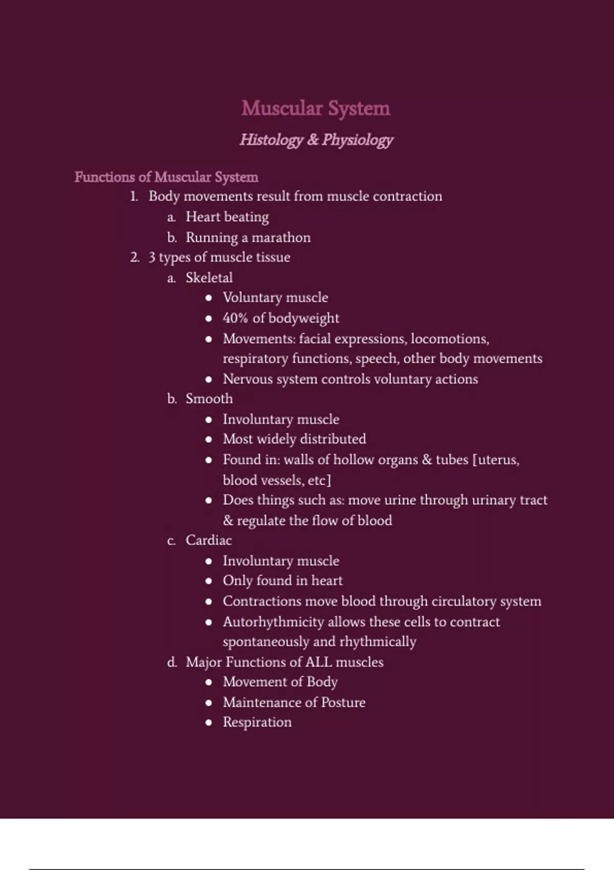Notes on muscular system chapter of textbook; sections: 1. Functions of Muscular System 2. General Properties of Muscle Tissue 3. Skeletal Muscle Anatomy
