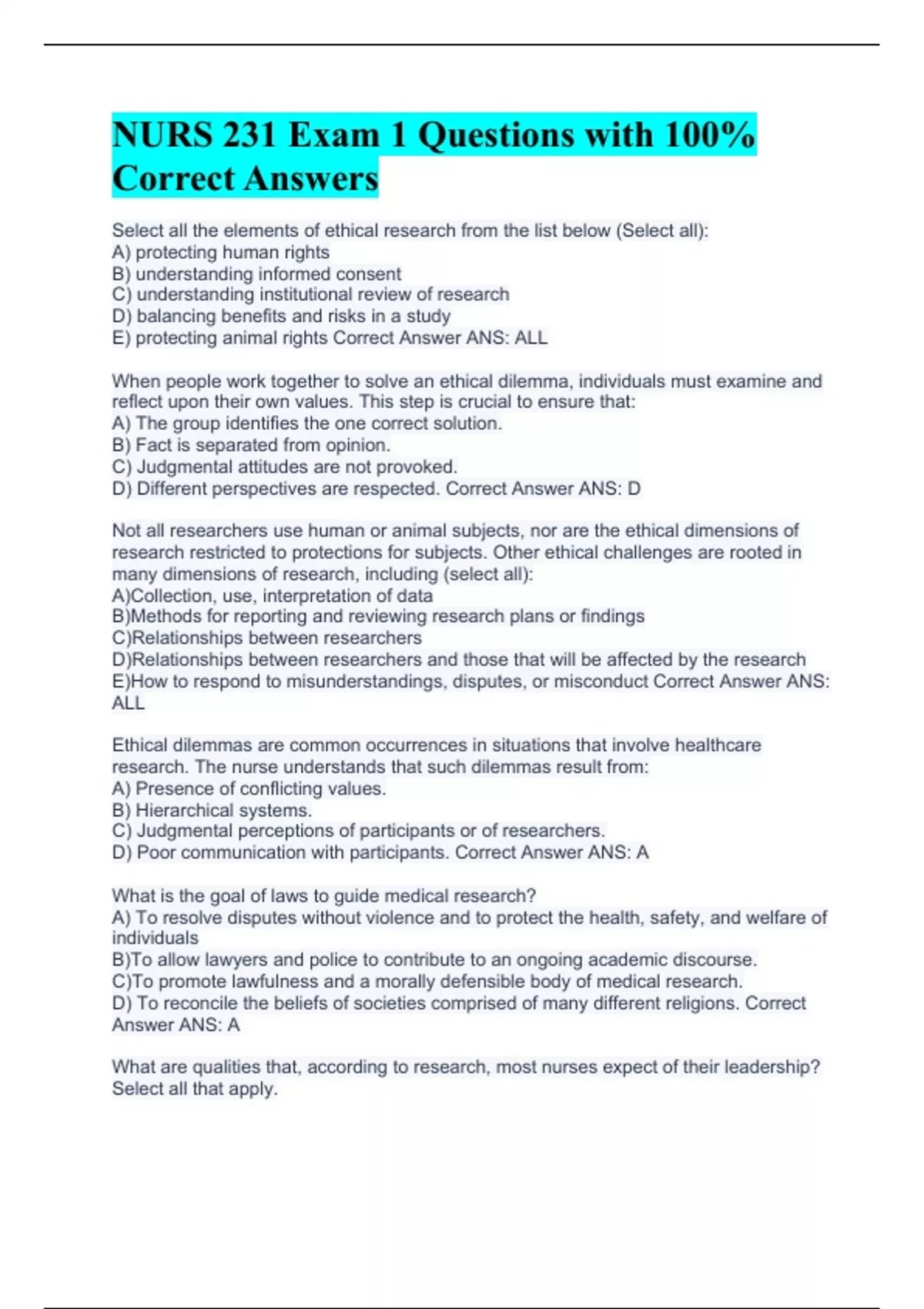 Select all the elements of ethical research from the list below (Select all): A) protecting human rights B) understanding informed consent C) understanding institutional review of research D) balancing benefits and risks in a study E) protecting animal rights Correct Answer ANS: ALL When people work together to solve an ethical dilemma, individuals must examine and reflect upon their own values. This step is crucial to ensure that: A) The group identifies the one correct solution. B) Fact is separated from opinion. C) Judgmental attitudes are not provoked. D) Different perspectives are respected. Correct Answer ANS: D Not all researchers use human or animal subjects, nor are the ethical dimensions of research restricted to protections for subjects. Other ethical challenges are rooted in many dimensions of research, including (select all): A)Collection, use, interpretation of data B)Methods for reporting and reviewing research plans or findings C)Relationships between researchers D)Relationships between researchers and those that will be affected by the research E)How to respond to misunderstandings, disputes, or misconduct Correct Answer ANS: ALL Ethical dilemmas are common occurrences in situations that involve healthcare research. The nurse understands that such dilemmas result from: A) Presence of conflicting values. B) Hierarchical systems. C) Judgmental perceptions of participants or of researchers. D) Poor communication with participants. Correct Answer ANS: A What is the goal of laws to guide medical research? A) To resolve disputes without violence and to protect the health, safety, and welfare of individuals B)To allow lawyers and police to contribute to an ongoing academic discourse. C)To promote lawfulness and a morally defensible body of medical research. D) To reconcile the beliefs of societies comprised of many different religions. Correct Answer ANS: A What are qualities that, according to research, most nurses expect of their leadership? Select all that apply.