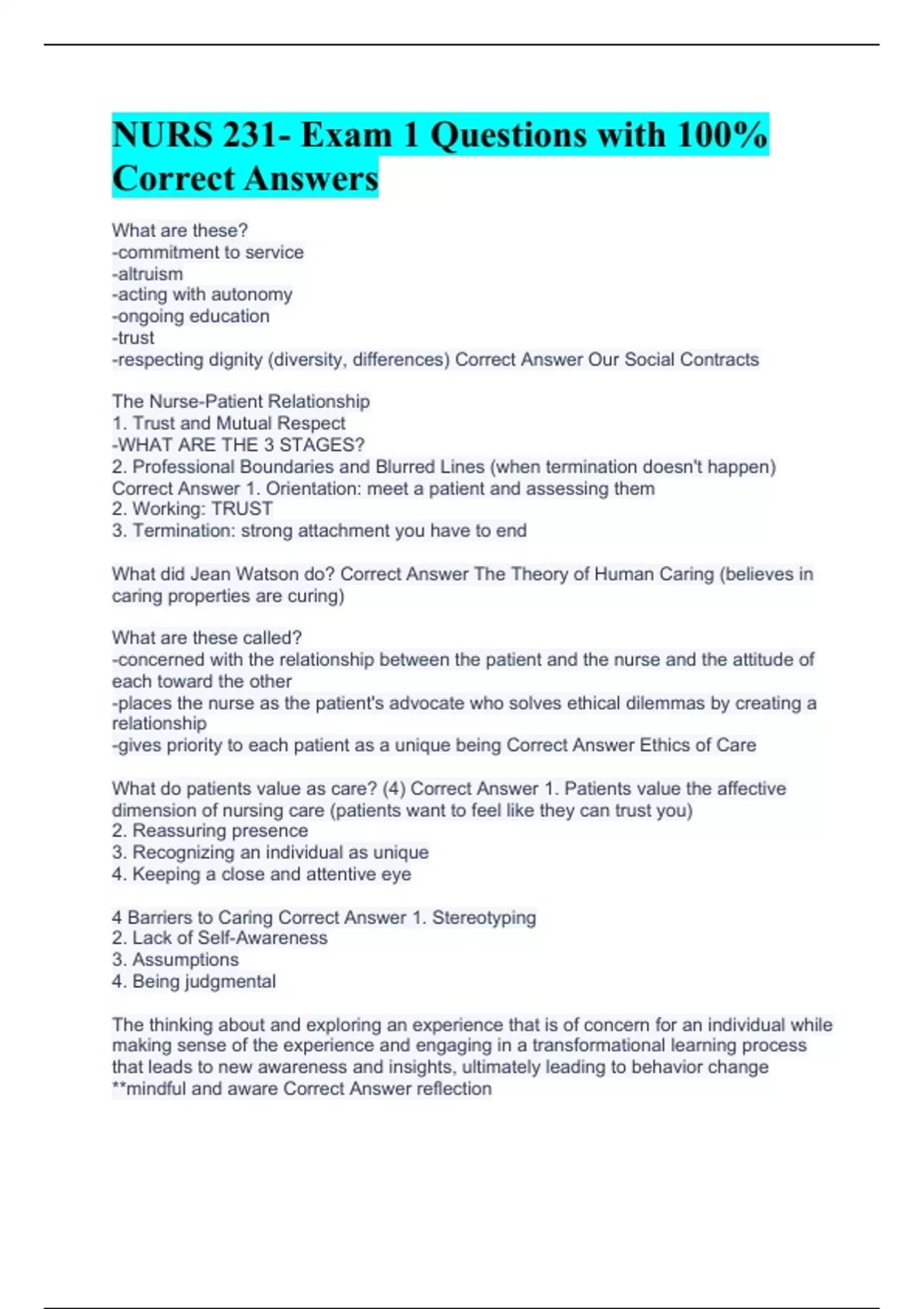 What are these? -commitment to service -altruism -acting with autonomy -ongoing education -trust -respecting dignity (diversity, differences) Correct Answer Our Social Contracts The Nurse-Patient Relationship 1. Trust and Mutual Respect -WHAT ARE THE 3 STAGES? 2. Professional Boundaries and Blurred Lines (when termination doesn't happen) Correct Answer 1. Orientation: meet a patient and assessing them 2. Working: TRUST 3. Termination: strong attachment you have to end What did Jean Watson do? Correct Answer The Theory of Human Caring (believes in caring properties are curing) What are these called? -concerned with the relationship between the patient and the nurse and the attitude of each toward the other -places the nurse as the patient's advocate who solves ethical dilemmas by creating a relationship -gives priority to each patient as a unique being Correct Answer Ethics of Care What do patients value as care? (4) Correct Answer 1. Patients value the affective dimension of nursing care (patients want to feel like they can trust you) 2. Reassuring presence 3. Recognizing an individual as unique 4. Keeping a close and attentive eye 4 Barriers to Caring Correct Answer 1. Stereotyping 2. Lack of Self-Awareness 3. Assumptions 4. Being judgmental The thinking about and exploring an experience that is of concern for an individual while making sense of the experience and engaging in a transformational learning process that leads to new awareness and insights, ultimately leading to behavior change **mindful and aware Correct Answer reflection
