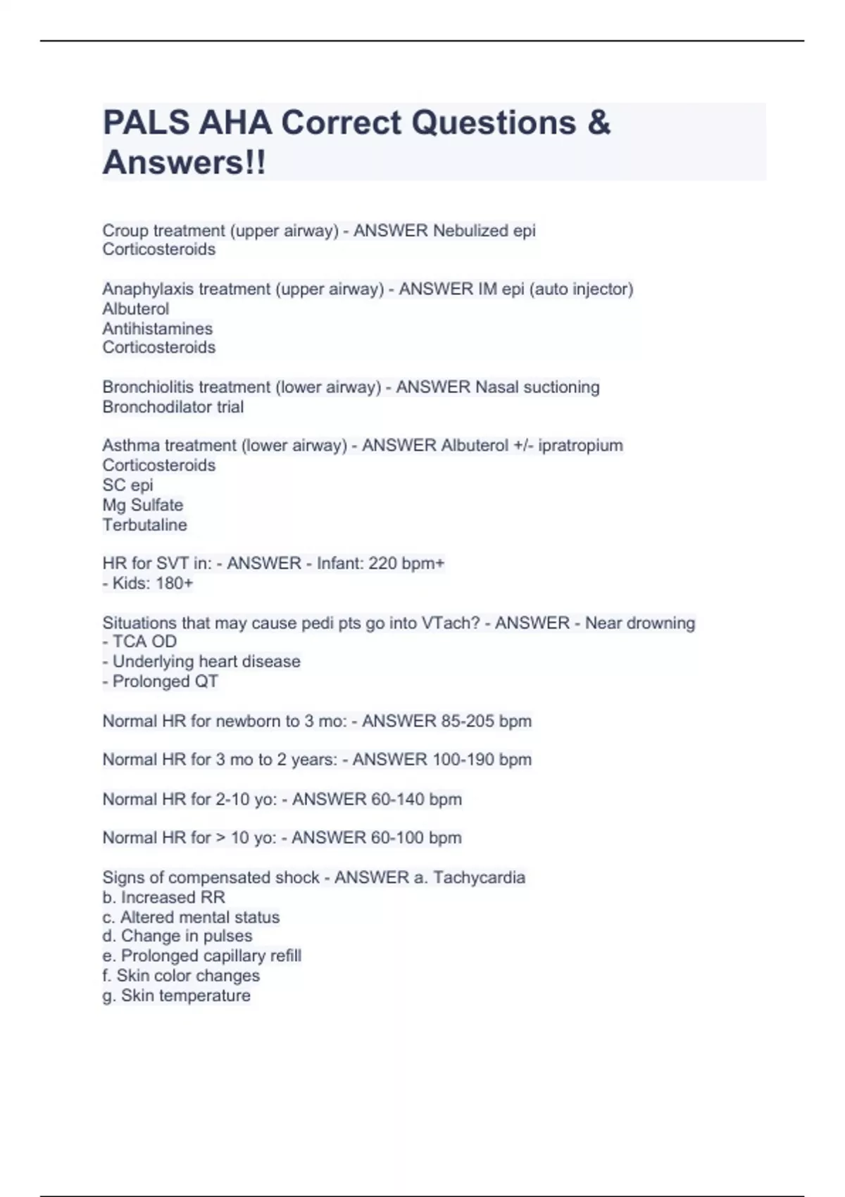 Croup treatment (upper airway) - ANSWER Nebulized epi Corticosteroids Anaphylaxis treatment (upper airway) - ANSWER IM epi (auto injector) Albuterol Antihistamines Corticosteroids Bronchiolitis treatment (lower airway) - ANSWER Nasal suctioning Bronchodilator trial Asthma treatment (lower airway) - ANSWER Albuterol +/- ipratropium Corticosteroids SC epi Mg Sulfate Terbutaline HR for SVT in: - ANSWER - Infant: 220 bpm+ - Kids: 180+ Situations that may cause pedi pts go into VTach? - ANSWER - Near drowning - TCA OD - Underlying heart disease - Prolonged QT Normal HR for newborn to 3 mo: - ANSWER 85-205 bpm Normal HR for 3 mo to 2 years: - ANSWER 100-190 bpm Normal HR for 2-10 yo: - ANSWER 60-140 bpm Normal HR for 10 yo: - ANSWER 60-100 bpm Signs of compensated shock - ANSWER a. Tachycardia b. Increased RR c. Altered mental status d. Change in pulses