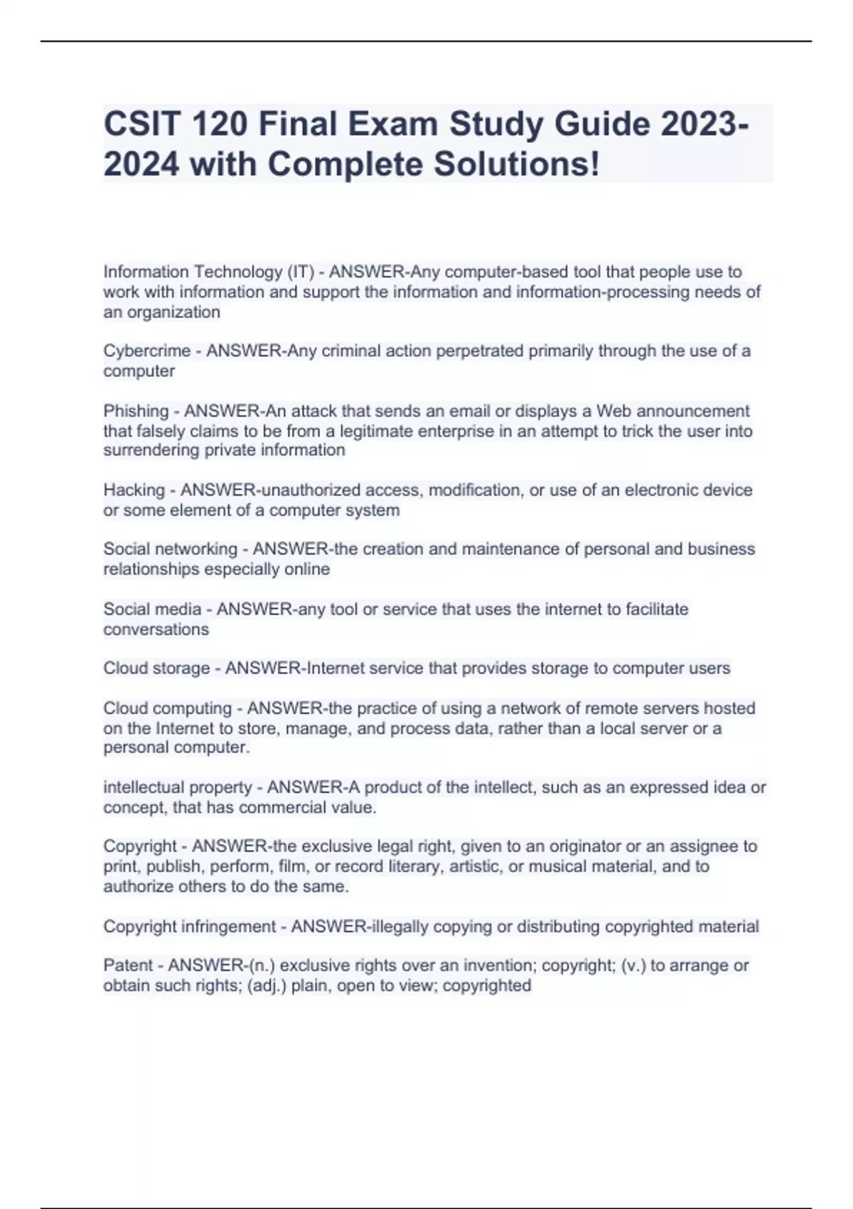 CSIT 120 Final Exam Study Guide with Complete Solutions! Information Technology (IT) - ANSWER-Any computer-based tool that people use to work with information and support the information and information-processing needs of an organization Cybercrime - ANSWER-Any criminal action perpetrated primarily through the use of a computer Phishing - ANSWER-An attack that sends an email or displays a Web announcement that falsely claims to be from a legitimate enterprise in an attempt to trick the user into surrendering private information Hacking - ANSWER-unauthorized access, modification, or use of an electronic device or some element of a computer system Social networking - ANSWER-the creation and maintenance of personal and business relationships especially online Social media - ANSWER-any tool or service that uses the internet to facilitate conversations Cloud storage - ANSWER-Internet service that provides storage to computer users Cloud computing - ANSWER-the practice of using a network of remote servers hosted on the Internet to store, manage, and process data, rather than a local server or a personal computer. intellectual property - ANSWER-A product of the intellect, such as an expressed idea or c