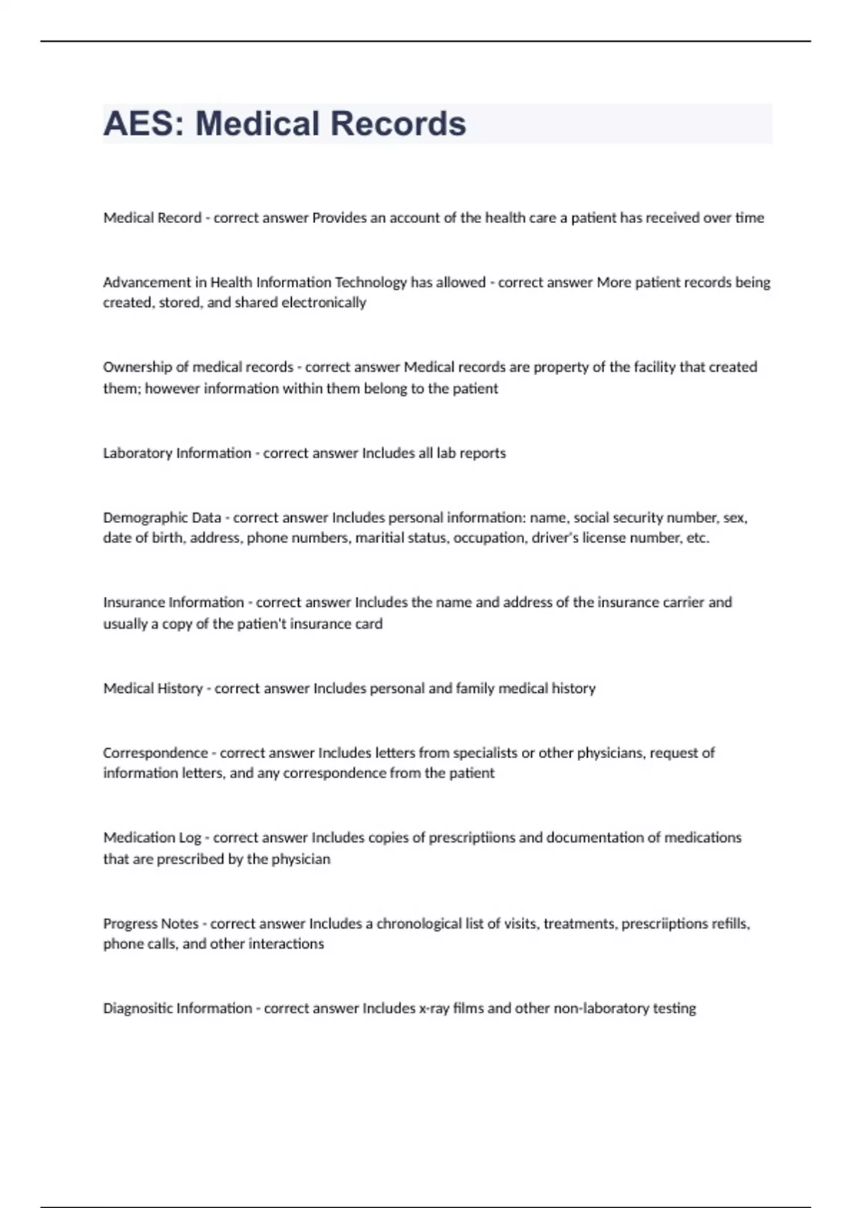 AES Medical Records Medical Record - correct answer Provides an account of the health care a patient has received over time Advancement in Health Information Technology has allowed - correct answer More patient records being created, stored, and shared electronically Ownership of medical records - correct answer Medical records are property of the facility that created them; however information within them belong to the patient Laboratory Information - correct answer Includes all lab reports Demographic Data - correct answer Includes personal information: name, social security number, sex, date of birth, address, phone numbers, maritial status, occupation, driver's license number, etc. Insurance Information - correct answer Includes the name and address of the insurance carrier and usually a copy of the patien't insurance card Medical History - correct answer Includes personal and family medical history Correspondence - correct answer Includes letters from specialists or other physicians, request of information letters, and any correspondence from the patient Medication Log - correct answer Includes copies of prescriptiions and documentation of medications that are prescribed by the physician Progress Notes - correct answer Includes a chronological list of visits, treatments, prescriiptions refills, phone calls, and other interactions Diagnositic Information - correct answer Includes x-ray films and other non-laboratory testing Referrals - correct answer Includes copies of forms and letters sent to specialists or other physicians, insurance companies, and patients Past Medical Records - correct answer Includs medical records from prior physicians Importance of Accuracy - correct answer According to law, if no account of an incident appears in a medical record, then the incident did not exist Audits - correct answer An inspection and verification of a facility's records and supporting documents Medical office assistants - correct answer Keep all records neat and orderly so that the facility does not fail the audit Source-oriented medical records - correct answer Separate information according to its source, or type; divided into sections (physicians notes, consultations, laboratory results, etc.) Problem-oriented medical records - correct answer Arrange information by medical problem allowing physicians to easily view trends in the patients health Strict Chronological Arrangement - correct answer Items are arranged by date, regardless of what type of information it is Shingling - correct answer Items that are smaller than a standard-size paper are staggered across a special page with self-adhesive strips Integrated - correct answer Combines all four types of medical records EMR - correct answer Electronic Medical Record CPOE - correct answer Computerized Physician Order Entry; process of electronically entering and sending tratement instructions instead of sending them by paper, fax, or phone