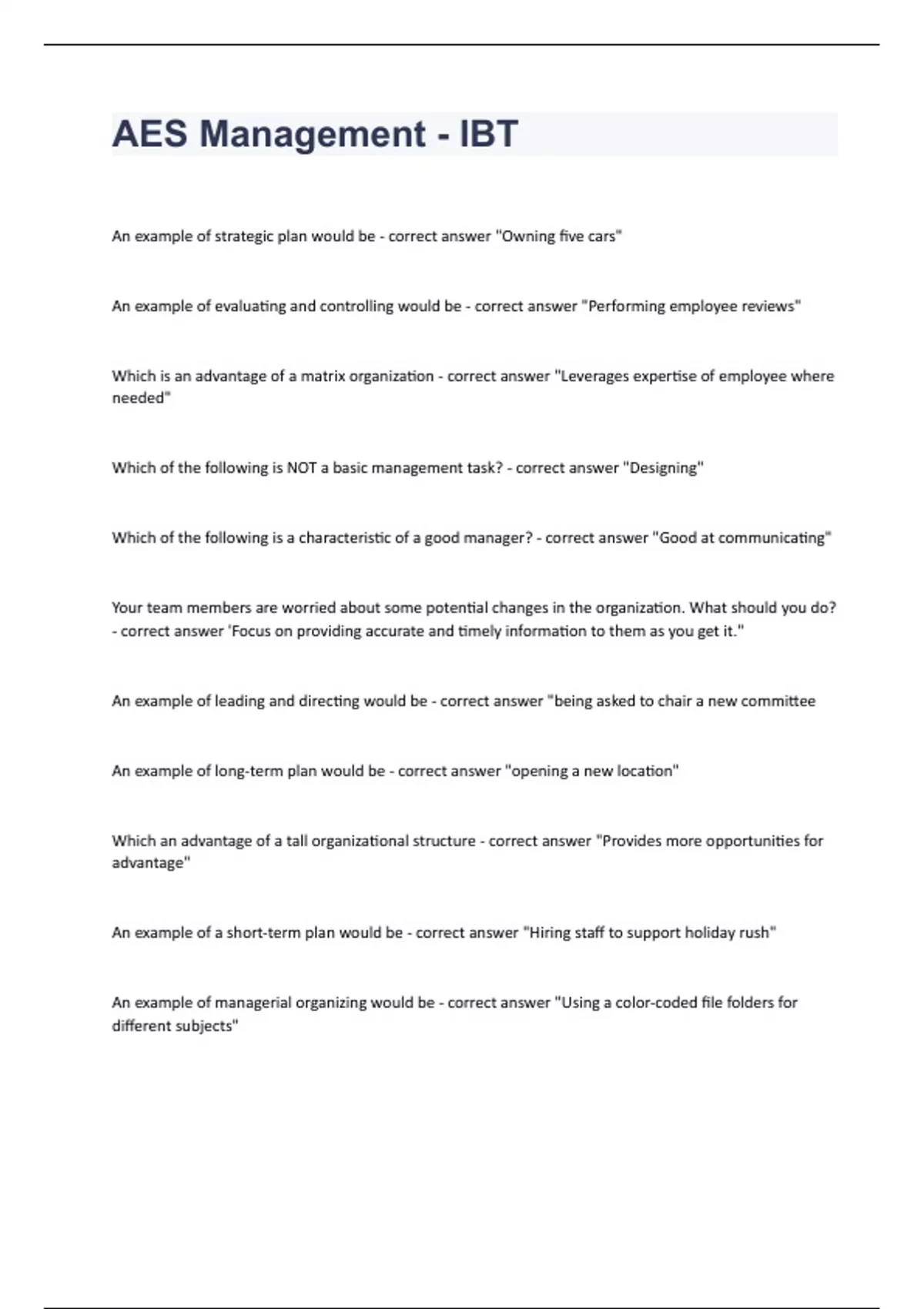 AES Management - IBT questions with 100% correct answers