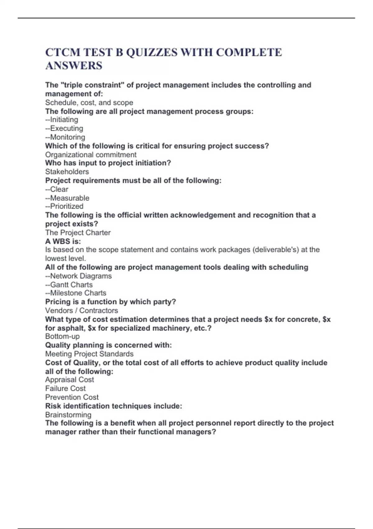 CTCM TEST B QUIZZES WITH COMPLETE ANSWERS The "triple constraint" of project management includes the controlling and management of: Schedule, cost, and scope The following are all project management process groups: --Initiating --Executing --Monitoring Which of the following is critical for ensuring project success? Organizational commitment Who has input to project initiation? Stakeholders Project requirements must be all of the following: --Clear --Measurable --Prioritized The following is the official written acknowledgement and recognition that a project exists? The Project Charter A WBS is: Is based on the scope statement and contains work packages (deliverable's) at the lowest level.