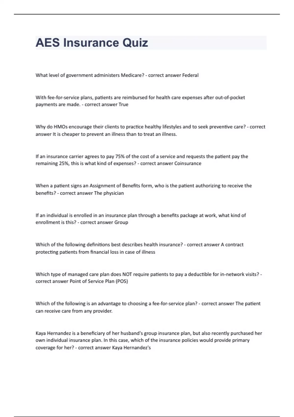 AES Insurance QuizWhat level of government administers Medicare? - correct answer Federal With fee-for-service plans, patients are reimbursed for health care expenses after out-of-pocket payments are made. - correct answer True Why do HMOs encourage their clients to practice healthy lifestyles and to seek preventive care? - correct answer It is cheaper to prevent an illness than to treat an illness. If an insurance carrier agrees to pay 75% of the cost of a service and requests the patient pay the remaining 25%, this is what kind of expenses? - correct answer Coinsurance When a patient signs an Assignment of Benefits form, who is the patient authorizing to receive the benefits? - correct answer The physician If an individual is enrolled in an insurance plan through a benefits package at work, what kind of enrollment is this? - correct answer Group Which of the following definitions best describes health insurance? - correct answer A contract protecting patients from financial loss in case of illness Which type of managed care plan does NOT require patients to pay a deductible for in-network visits? - correct answer Point of Service Plan (POS) Which of the following is an advantage to choosing a fee-for-service plan? - correct answer The patient can receive care from any provider. Kaya Hernandez is a beneficiary of her husband's group insurance plan, but also recently purchased her own individual insurance plan. In this case, which of the insurance policies would provide primary coverage for her? - correct answer Kaya Hernandez's What is the goal of managed care insurance? - correct answer To reduce medical expenses by maintaining healthy lifestyles Who grants pre-authorization for treatments? - correct answer Insurance carrier Which type of managed care plan generally reimburse physicians using capitation? - correct answer Health maintenance organizations A medical office assistant must do the following for all new patients? - correct answer Make a copy of the patient's medical insurance card What is an insurance carrier? - correct answer A company that provides insurance plans What is one advantage of individual insurance over group insurance? - correct answer More choice of policies How often must a patient meet the deductible? - correct answer Each year Jesse Lukas is a beneficiary of both his mother's and his father's insurance policies. His mother's birthday is November 1, and his father's birthday is on December 2. Which parent's policy will provide Jesse's primary coverage? - correct answer His mother's If there is doubt about a patient's insurance eligibility, who should the assistant contact? - correct answer The insurance carrier Why do managed care plans require patients to obtain referrals before visiting specialists? - correct answer To support the medical necessity of the visit