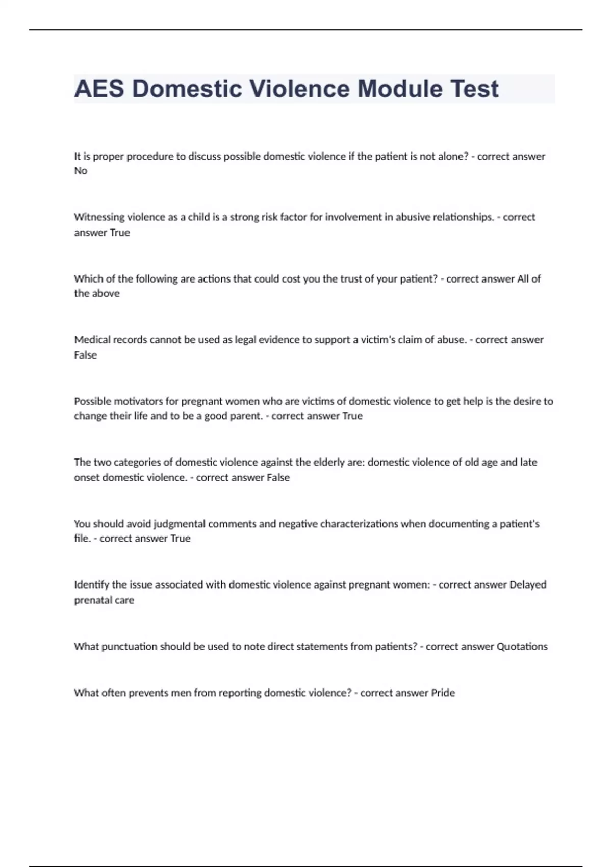 AES Domestic Violence Module TestIt is proper procedure to discuss possible domestic violence if the patient is not alone? - correct answer No Witnessing violence as a child is a strong risk factor for involvement in abusive relationships. - correct answer True Which of the following are actions that could cost you the trust of your patient? - correct answer All of the above Medical records cannot be used as legal evidence to support a victim's claim of abuse. - correct answer False Possible motivators for pregnant women who are victims of domestic violence to get help is the desire to change their life and to be a good parent. - correct answer True The two categories of domestic violence against the elderly are: domestic violence of old age and late onset domestic violence. - correct answer False You should avoid judgmental comments and negative characterizations when documenting a patient's file. - correct answer True Identify the issue associated with domestic violence against pregnant women: - correct answer Delayed prenatal care What punctuation should be used to note direct statements from patients? - correct answer Quotations What often prevents men from reporting domestic violence? - correct answer Pride Domestic violence is the victimization of an individual with whom the abuser has not had an intimate or romantic relationship. - correct answer False Which of the following is a way that proper documentation can help in cases of domestic violence? - correct answer Help make other providers aware of the situation. Approximately how many adolescent girls in the U.S. are victims of domestic violence from a dating partner? - correct answer 1 in 5 Once a patient has confirmed domestic violence, one step you should take is to help the victim assess their immediate safety and the safety of any involved children. - correct answer True Which of the following is an example of how healthcare professionals can be of help to victims? - correct answer Proper documentation Domestic violence can affect people from all socioeconomic levels, all races, and in both heterosexual and same sex relationships? - correct answer True Children who live in homes where there is domestic violence suffer abuse or neglect at much higher rates of up to: - correct answer 60% Which of the following is an increased health risk of children exposed to domestic violence? - correct answer Frequent headaches Which of the following is an example of psychological abuse? - correct answer Name calling