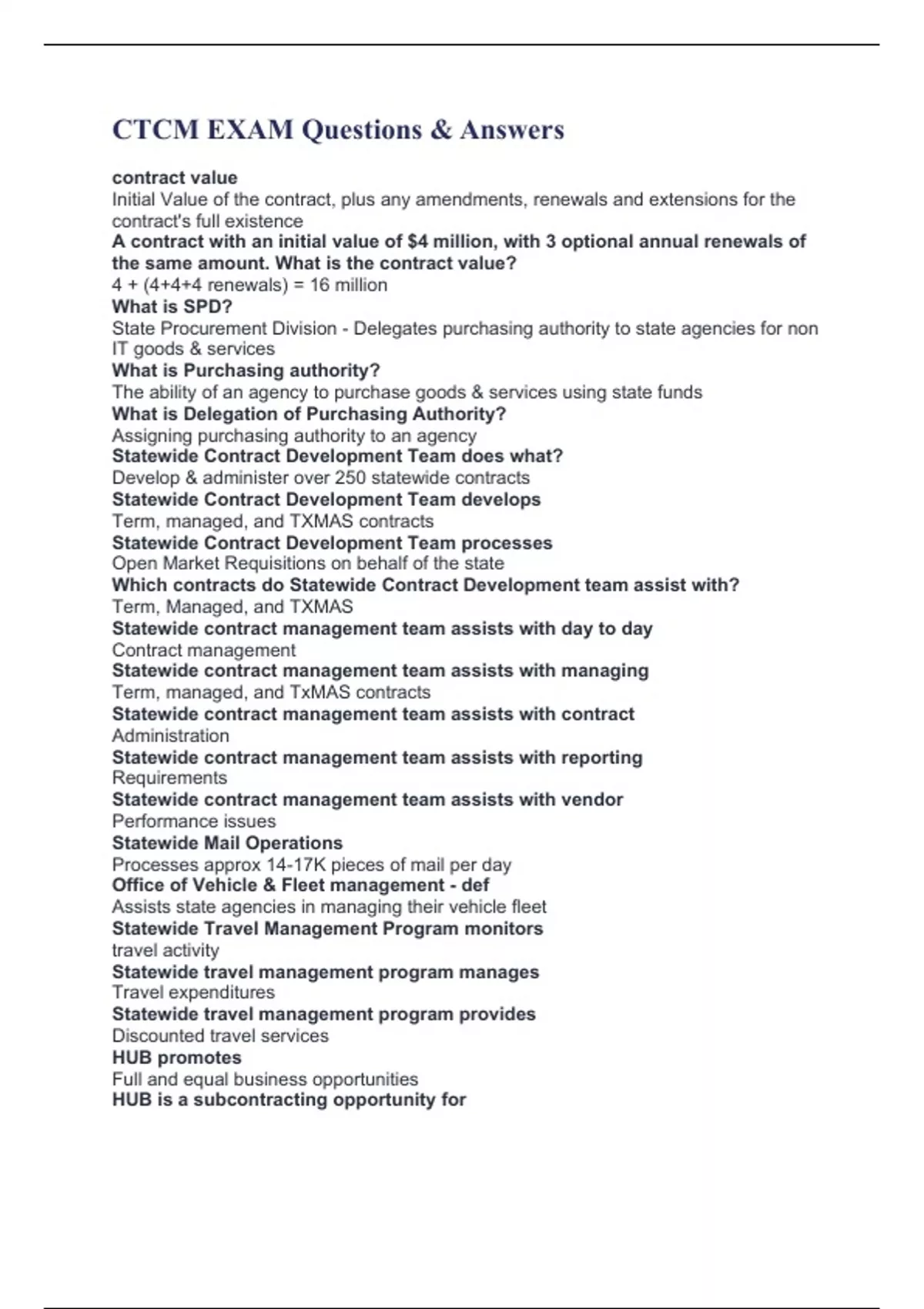 CTCM EXAM Questions & Answers contract value Initial Value of the contract, plus any amendments, renewals and extensions for the contract's full existence A contract with an initial value of $4 million, with 3 optional annual renewals of the same amount. What is the contract value? 4 + (4+4+4 renewals) = 16 million What is SPD? State Procurement Division - Delegates purchasing authority to state agencies for non IT goods & services What is Purchasing authority? The ability of an agency to purchase goods & services using state funds What is Delegation of Purchasing Authority? Assigning purchasing authority to an agency Statewide Contract Development Team does what? Develop & administer over 250 statewide contracts Statewide Contract Development Team develops Term, managed, and TXMAS contracts Statewide Contract Development Team processes Open Market Requisitions on behalf of the state Which contracts do Statewide Contract Development team assist with? Term, Managed, and TXMAS Statewide contract management team assists with day to day