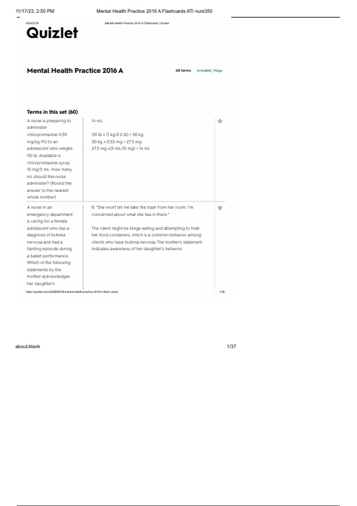 ,11/17/23, 2:50 PM Mental Health Practice 2016 A Flashcards ATI nurs350