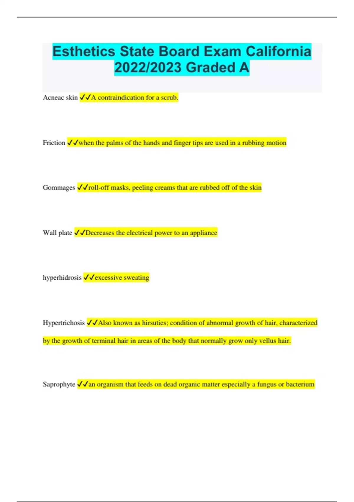 Acneac skin A contraindication for a scrub. Friction when the palms of the hands and finger tips are used in a rubbing motion Gommages roll-off masks, peeling creams that are rubbed off of the skin Wall plate Decreases the electrical power to an appliance hyperhidrosis excessive sweating Hypertrichosis Also known as hirsuties; condition of abnormal growth of hair, characterized by the growth of terminal hair in areas of the body that normally grow only vellus hair. Saprophyte an organism that feeds on dead organic matter especially a fungus or bacterium
