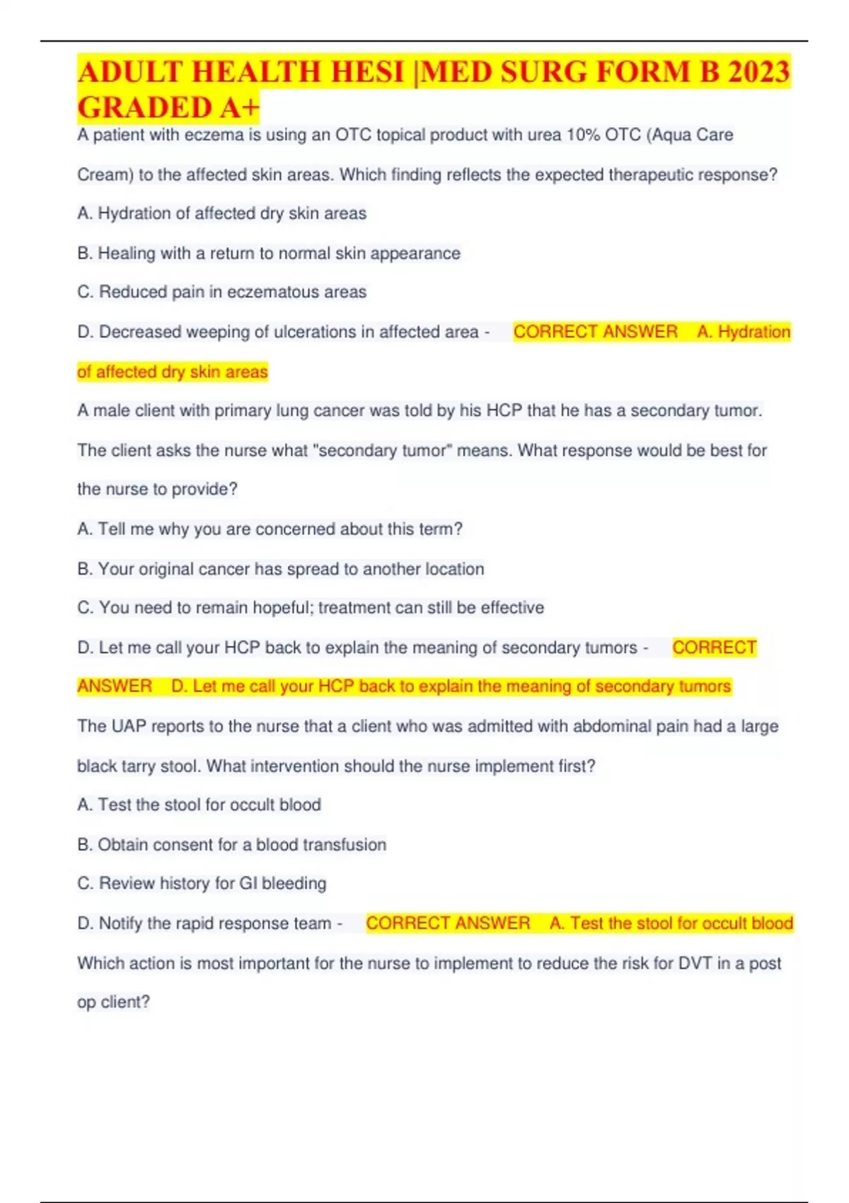 ADULT HEALTH HESI |MED SURG FORM B 2023 GRADED A+ A patient with eczema is using an OTC topical product with urea 10% OTC (Aqua Care Cream) to the affected skin areas. Which finding reflects the expected therapeutic response? A. Hydration of affected dry skin areas B. Healing with a return to normal skin appearance C. Reduced pain in eczematous areas D. Decreased weeping of ulcerations in affected area - CORRECT ANSWER A. Hydration of affected dry skin areas A male client with primary lung cancer was told by his HCP that he has a secondary tumor. The client asks the nurse what "secondary tumor" means. What response would be best for the nurse to provide? A. Tell me why you are concerned about this term? B. Your original cancer has spread to another location C. You need to remain hopeful; treatment can still be effective D. Let me call your HCP back to explain the meaning of secondary tumors - CORRECT ANSWER D. Let me call your HCP back to explain the meaning of secondary tumors The UAP reports to the nurse that a client who was admitted with abdominal pain had a large black tarry stool. What intervention should the nurse implement first? A. Test the stool for occult blood B. Obtain consent for a blood transfusion C. Review history for GI bleeding D. Notify the rapid response team - CORRECT ANSWER A. Test the stool for occult blood Which action is most important for the nurse to implement to reduce the risk for DVT in a post op client?