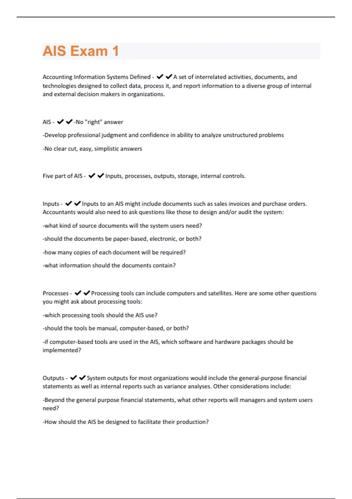 Accounting Information Systems Defined - A set of interrelated activities, documents, and technologies designed to collect data, process it, and report information to a diverse group of internal and external decision makers in organizations. AIS - -No "right" answer -Develop professional judgment and confidence in ability to analyze unstructured problems -No clear cut, easy, simplistic answers Five part of AIS - Inputs, processes, outputs, storage, internal controls. Inputs - Inputs to an AIS might include documents such as sales invoices and purchase orders. Accountants would also need to ask questions like those to design and/or audit the system: -what kind of source documents will the system users need? -should the documents be paper-based, electronic, or both? -how many copies of each document will be required? -what information should the documents contain? Processes - Processing tools can include computers and satellites. Here are some other questions you might ask about processing tools: -which processing tools should the AIS use? -should the tools be manual, computer-based, or both? -if computer-based tools are used in the AIS, which software and hardware packages should be implemented? Outputs - System outputs for most organizations would include the general-purpose financial statements as well as internal reports such as variance analyses. Other considerations include: -Beyond the general purpose financial statements, what other reports will managers and system users need? -How should the AIS be designed to facilitate their production?Storage - Data in an AIS system could be stored locally (as in a cash register or a transactions file) or remotely (as on an external network). Organizations also might maintain paper-based records of transactions. Relevant questions about storage include: -How should data be stored? On paper? Electronically? Both? -Where should the data be stored? Locally? Remotely? Both? -How long should data be stored? -Under what conditions can/should data be destroyed? Internal Controls (AIS Structure) - Most organizations employ internal controls such as daily backup of data and separation of duties (custody, authority, and record keeping) to maintain control over specific assets. Other questions might be: -What controls are necessary to promote information integrity in the AIS? -What behavioral effects are the controls likely to have? -Are the controls cost-effective?