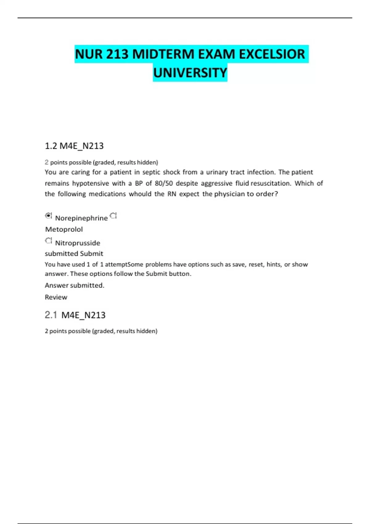 NUR 213 MIDTERM EXAM EXCELSIOR UNIVERSITY