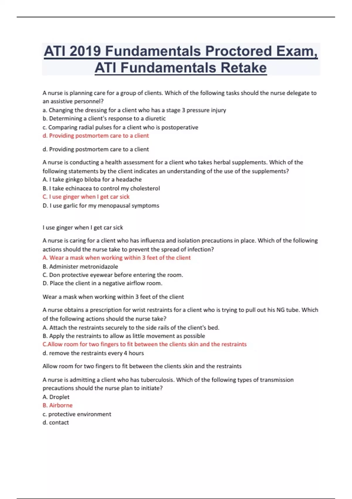 ATI 2019/2024 Fundamentals Proctored Exam, ATI Fundamentals Retake latest correct verified answers