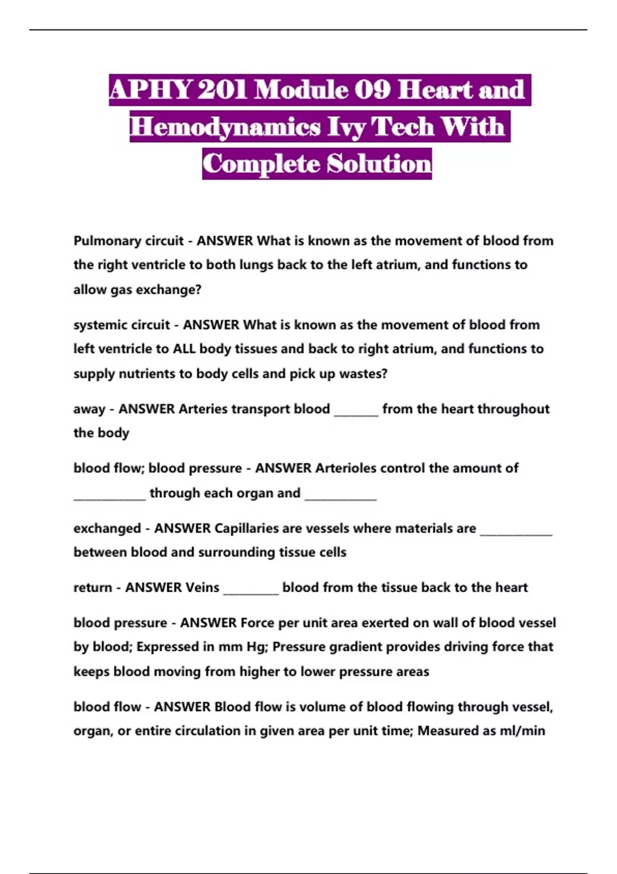 APHY 201 Module 09 Heart and Hemodynamics Ivy Tech With Complete Solution