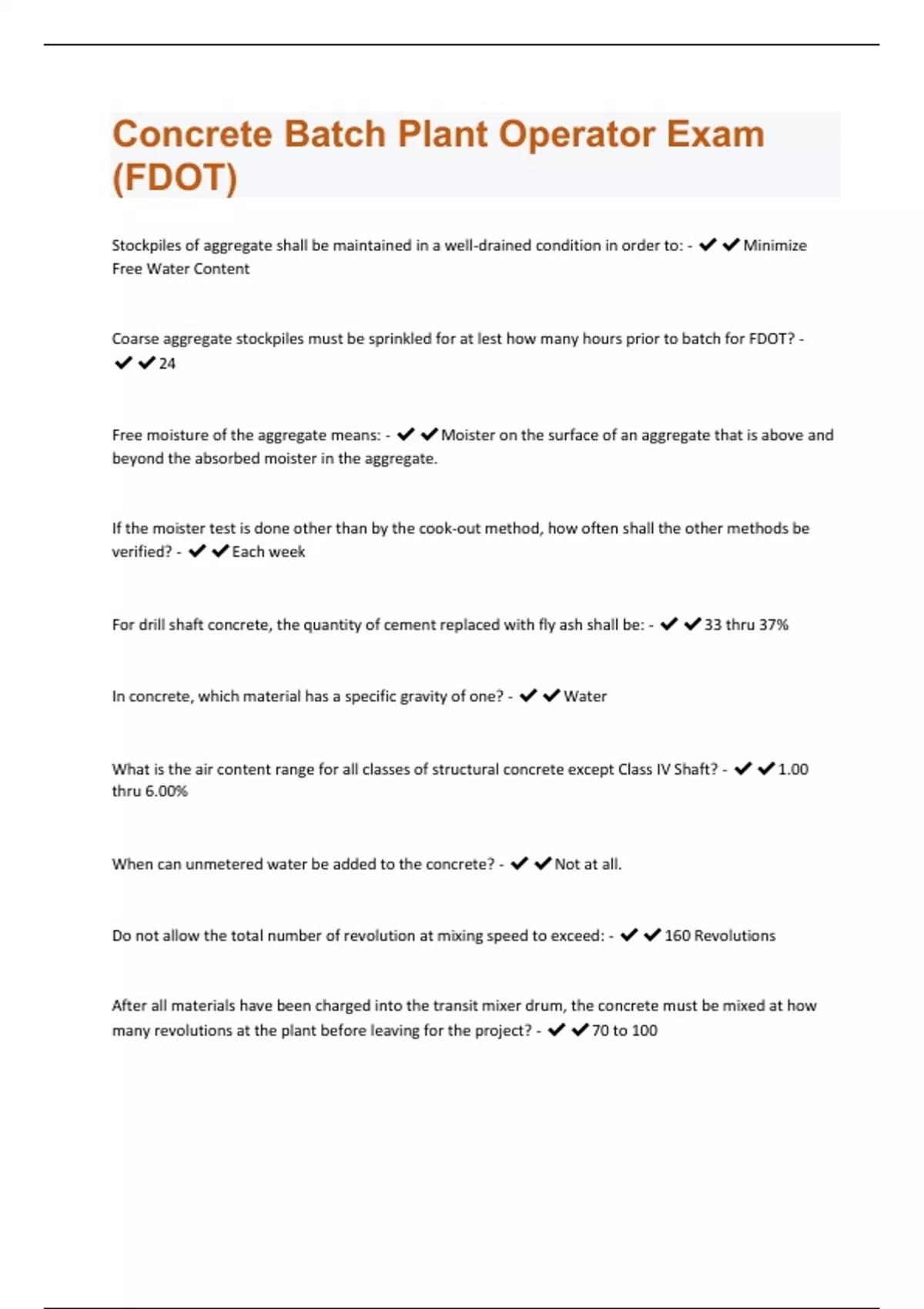 Concrete Batch Plant Operator Exam (FDOT) Exam Questions With 100% Correct Answers.