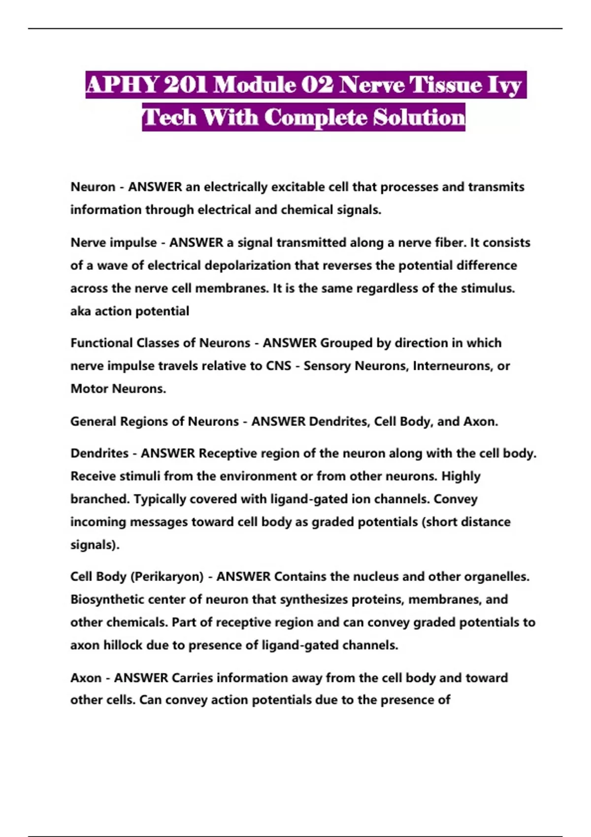 APHY 201 Module 02 Nerve Tissue Ivy Tech With Complete Solution...