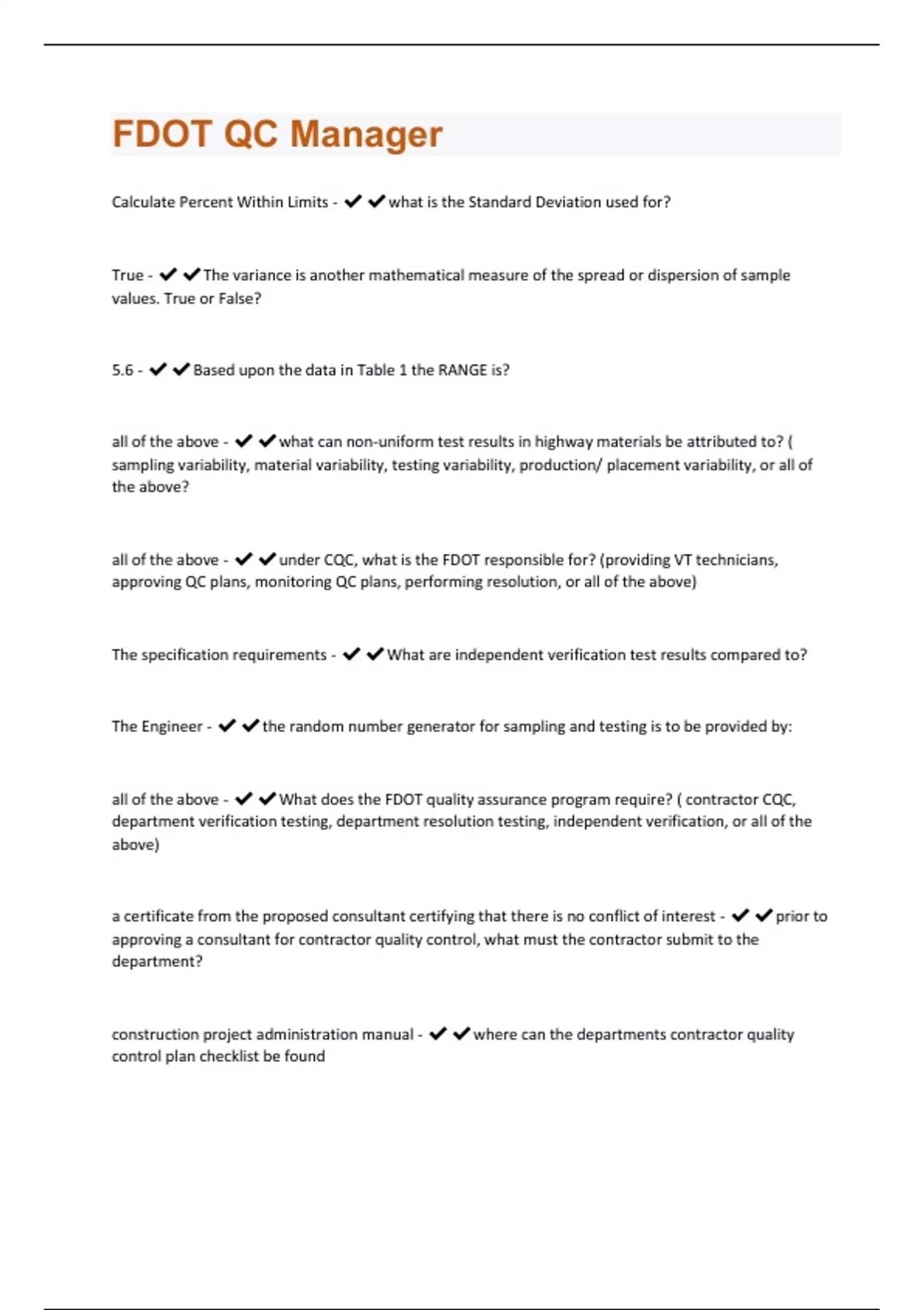 Calculate Percent Within Limits - what is the Standard Deviation used for? True - The variance is another mathematical measure of the spread or dispersion of sample values. True or False? 5.6 - Based upon the data in Table 1 the RANGE is? all of the above - what can non-uniform test results in highway materials be attributed to? ( sampling variability, material variability, testing variability, production/ placement variability, or all of the above? all of the above - under CQC, what is the FDOT responsible for? (providing VT technicians, approving QC plans, monitoring QC plans, performing resolution, or all of the above) The specification requirements - What are independent verification test results compared to? The Engineer - the random number generator for sampling and testing is to be provided by: all of the above - What does the FDOT quality assurance program require? ( contractor CQC, department verification testing, department resolution testing, independent verification, or all of the above) a certificate from the proposed consultant certifying that there is no conflict of interest - prior to approving a consultant for contractor quality control, what must the contractor submit to the department? construction project administration manual - where can the departments contractor quality control plan checklist be foundall of the above - which of the following is the contractors responsibility for a project? ( develop the QC plan, provide a QC manager , monitor the QC plan requirements, maintain an approved QC plan, or all of the above