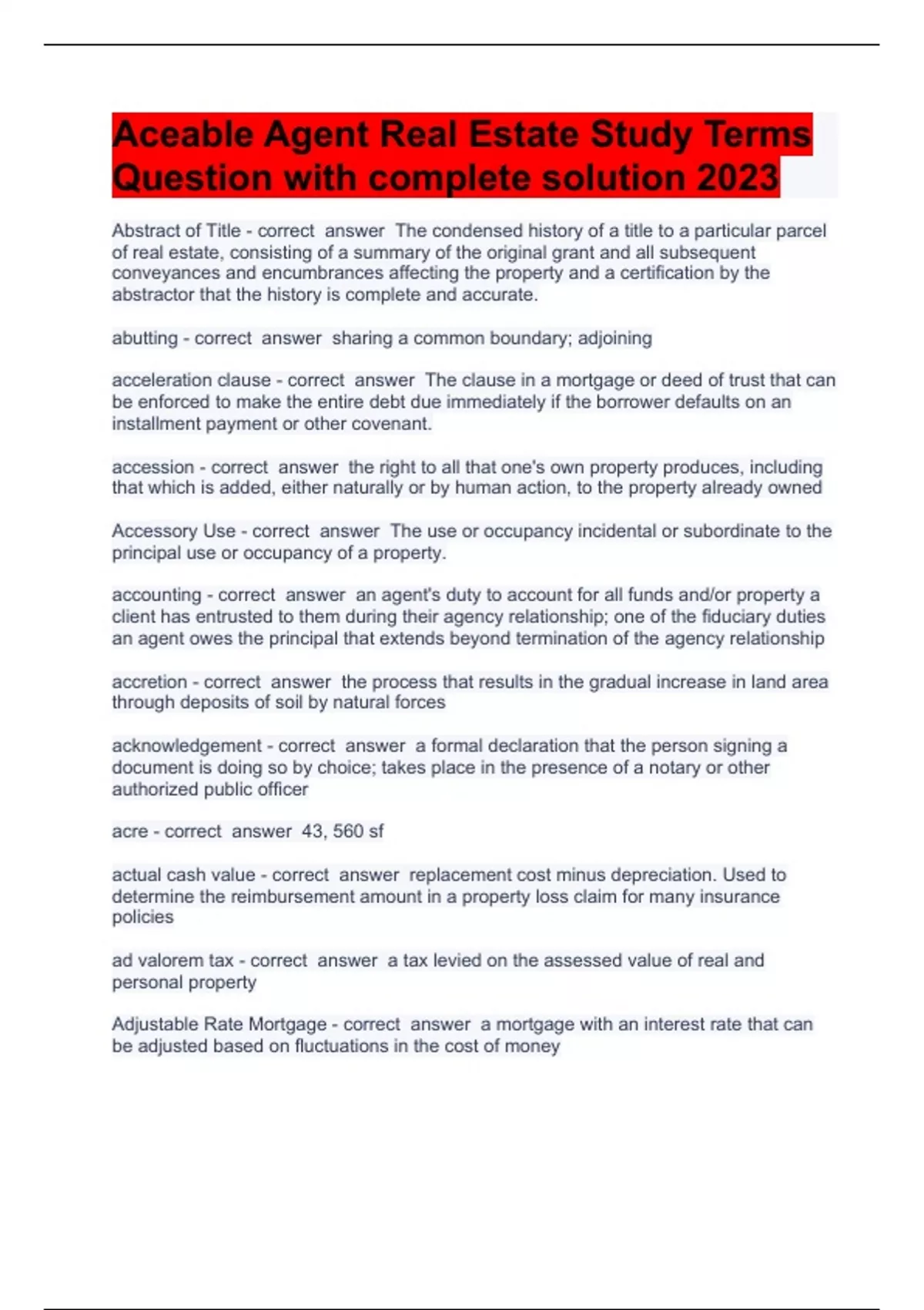 Aceable Agent Real Estate Study Terms Question with complete solution 2023/2024Abstract of Title - correct answer The condensed history of a title to a particular parcel of real estate, consisting of a summary of the original grant and all subsequent conveyances and encumbrances affecting the property and a certification by the abstractor that the history is complete and accurate. abutting - correct answer sharing a common boundary; adjoining acceleration clause - correct answer The clause in a mortgage or deed of trust that can be enforced to make the entire debt due immediately if the borrower defaults on an installment payment or other covenant. accession - correct answer the right to all that one's own property produces, including that which is added, either naturally or by human action, to the property already owned Accessory Use - correct answer The use or occupancy incidental or subordinate to the principal use or occupancy of a property. accounting - correct answer an agent's duty to account for all funds and/or property a client has entrusted to them during their agency relationship; one of the fiduciary duties an agent owes the principal that extends beyond termination of the agency relationship