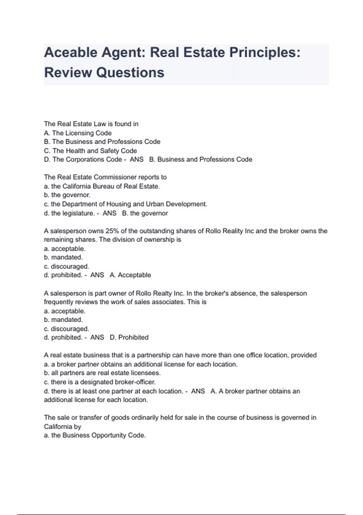 Aceable Agent: Real Estate Principles: Review Questions And Answers The Real Estate Law is found in A. The Licensing Code B. The Business and Professions Code C. The Health and Safety Code D. The Corporations Code - ANS B. Business and Professions Code The Real Estate Commissioner reports to a. the California Bureau of Real Estate. b. the governor. c. the Department of Housing and Urban Development. d. the legislature. - ANS B. the governor A salesperson owns 25% of the outstanding shares of Rollo Reality Inc and the broker owns the remaining shares. The division of ownership is a. acceptable. b. mandated. c. discouraged. d. prohibited. - ANS A. Acceptable A salesperson is part owner of Rollo Realty Inc. In the broker's absence, the salesperson frequently reviews the work of sales associates. This is a. acceptable. b. mandated. c. discouraged. d. prohibited. - ANS D. Prohibited A real estate business that is a partnership can have more than one office location, provided a. a broker partner obtains an additional license for each location. b. all partners are real estate licensees. c. there is a designated broker-officer. d. there is at least one partner at each location. - ANS A. A broker partner obtains an additional license for each location. The sale or transfer of goods ordinarily held for sale in the course of business is governed in California by a. the Business Opportunity Code. b. the Commercial Transfer Law. c. the Uniform Commercial Code. d. the Real Estate Law. - ANS C. The Uniform Commercial Code An officer of Ajax Corporation, who is not a real estate license, successfully negotiated the purchase of the Smith Widget Plant on behalf of Ajax. The officer received a commission on the sale in addition to his normal salary. The officer of Ajax Corporation. a. did not need a real estate license for the deal. b. should have had a real estate license. c. is exempt from licensing requirements. d. None of these - ANS B. Should have had a real estate license. If a real estate license is NOT renewed before it expires, the licensee a. is allowed to complete transactions in progress. b. is allowed to finish transactions that are substantially complete. c. must cease all real estate activities. d. may act under authority of another agent's license for a period not to exceed 60 days. - ANS C. Must cease all real estate activities