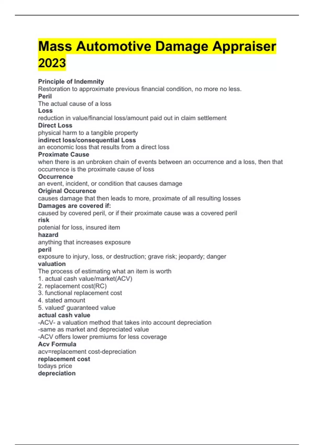 Mass Automotive Damage Appraiser 2023 Principle of Indemnity Restoration to approximate previous financial condition, no more no less. Peril The actual cause of a loss Loss reduction in value/financial loss/amount paid out in claim settlement Direct Loss physical harm to a tangible property indirect loss/consequential Loss an economic loss that results from a direct loss Proximate Cause when there is an unbroken chain of events between an occurrence and a loss, then that occurrence is the proximate cause of loss Occurrence an event, incident, or condition that causes damage Original Occurence causes damage that then leads to more, proximate of all resulting losses Damages are covered if: caused by covered peril, or if their proximate cause was a covered peril risk potenial for loss, insured item hazard anything that increases exposure peril exposure to injury, loss, or destruction; grave risk; jeopardy; danger valuation The process of estimating what an item is worth 1. actual cash value/market(ACV) 2. replacement cost(RC) 3. functional replacement cost 4. stated amount 5. valued' guaranteed value actual cash value -ACV- a valuation method that takes into account depreciation -same as market and depreciated value -ACV offers lower premiums for less coverage Acv Formula acv=replacement cost-depreciation replacement cost todays price depreciation an items estimated for loss value due to wear and tear/age Replacement Cost(RC) based on replacing an mite at current market prices regardless of depreciation Functional Replacement Cost Pays to replace an outdated obsolete item with a functionally equivalent item not identical -level of coverage falls between RC and ACV Stated Amount Property value is stated by the insured when applying for insurance -When loss occurs, policy pays up to the stated amount or ACV, whichever is less valued policy guaranteed value- determined prior to the issuance of policy Avoids the confusion of assessing appreciation or depreciation ACV Actual Cash Value usually beneficial to the policy holder ACV generally reflects current market value of an item policy limits establish the maximum payout of an insurance policy. in auto each type of coverage has a limit salvage portion or value property that remains after loss handling salvage 1. insurer deducts salvage from settlement amount 2. insurer takes ownership of damaged property after paying full value of damaged prop. 3. insurers often take ownership of vehicles after total loss abandonment clause insured is prohibited from forcing the insurer to take possession of damaged property for the purpose of repair or disposal different than salvage, where the insurer chooses to take possession of the damaged property after paying to replace it A pre-defined monetary potion of an insurance claim paid by a policy holder is a deductible Loss Payable Clause ensures the lender will be listed as a payee under the policy if damages occurs to the insured property deductible pre defined monetary portio