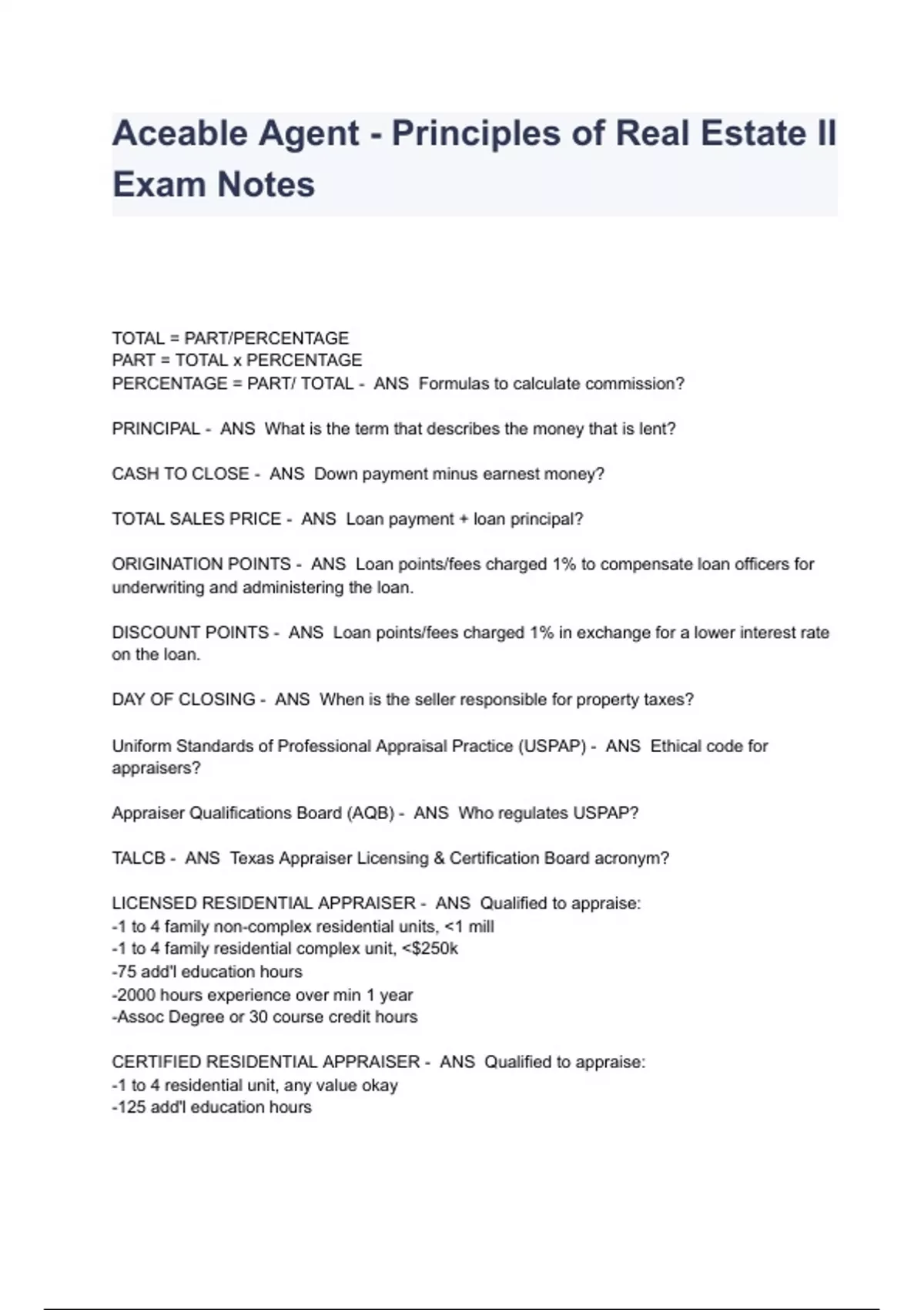 Aceable Agent - Principles of Real Estate II Exam Notes Questions With Correct Solutions TOTAL = PART/PERCENTAGE PART = TOTAL x PERCENTAGE PERCENTAGE = PART/ TOTAL - ANS Formulas to calculate commission? PRINCIPAL - ANS What is the term that describes the money that is lent? CASH TO CLOSE - ANS Down payment minus earnest money? TOTAL SALES PRICE - ANS Loan payment + loan principal? ORIGINATION POINTS - ANS Loan points/fees charged 1% to compensate loan officers for underwriting and administering the loan. DISCOUNT POINTS - ANS Loan points/fees charged 1% in exchange for a lower interest rate on the loan. DAY OF CLOSING - ANS When is the seller responsible for property taxes? Uniform Standards of Professional Appraisal Practice (USPAP) - ANS Ethical code for appraisers? Appraiser Qualifications Board (AQB) - ANS Who regulates USPAP? TALCB - ANS Texas Appraiser Licensing & Certification Board acronym? LICENSED RESIDENTIAL APPRAISER - ANS Qualified to appraise: -1 to 4 family non-complex residential units, <1 mill -1 to 4 family residential complex unit, <$250k -75 add'l education hours -2000 hours experience over min 1 year -Assoc Degree or 30 course credit hours CERTIFIED RESIDENTIAL APPRAISER - ANS Qualified to appraise: -1 to 4 residential unit, any value okay -125 add'l education hours -2,500 hours experience over min 2 years -Bach Degree or higher CERTIFIED GENERAL APPRAISER - ANS Qualified to appraise: -any type of property -225 add'l education hours -Bach Degree -3000 hours experience over min 2.5 years -1/2 experience must be non residential PRINCIPLE OF SUBSTITUTION - ANS The value of something is affected by the cost of getting a similar item elsewhere. Similar properties should have fairly similar values.