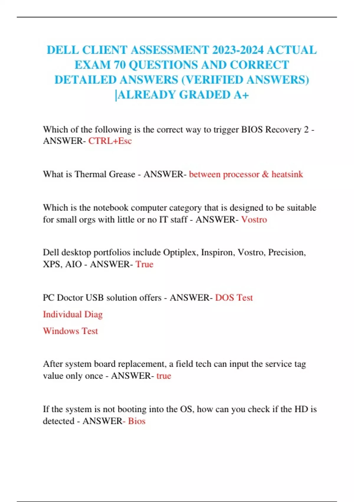 DELL CLIENT ASSESSMENT ACTUAL EXAM 70 QUESTIONS AND CORRECT DETAILED ANSWERS (VERIFIED ANSWERS) |ALREADY GRADED A+