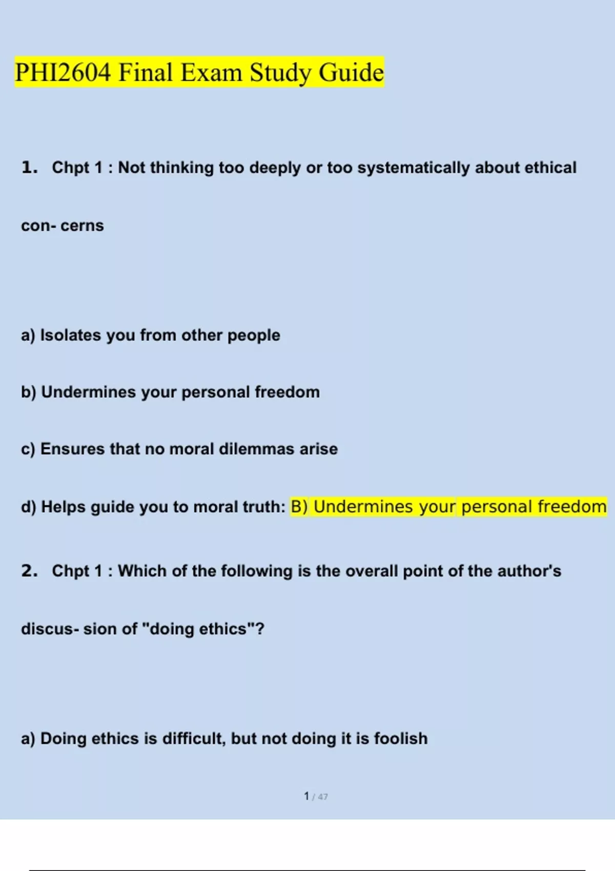 PHI 2604/ PHI2604 Proctored Final Exam Study Guide Updated Miami Dade College, Miami