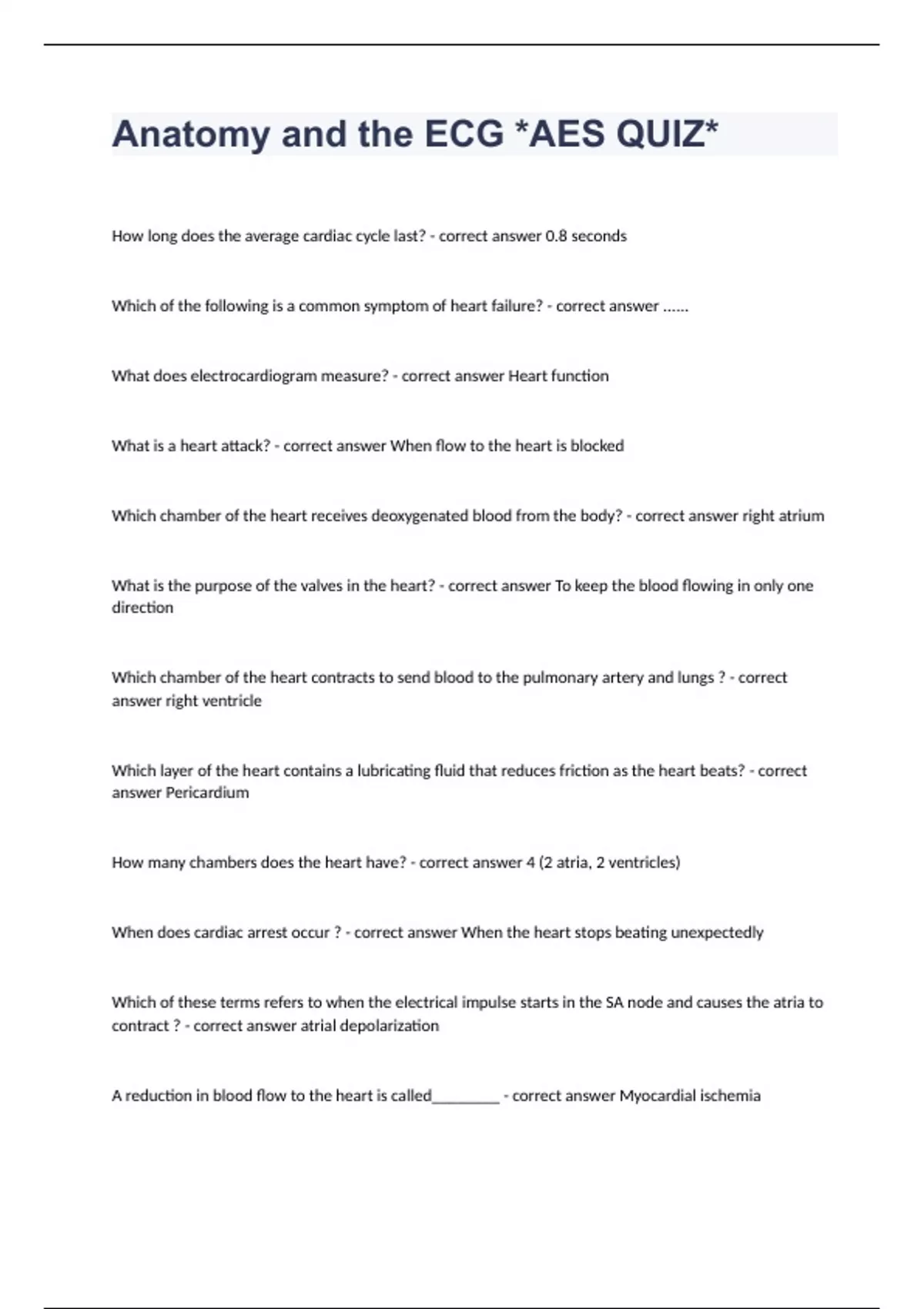 Anatomy and the ECG AES QUIZ How long does the average cardiac cycle last? - correct answer 0.8 seconds Which of the following is a common symptom of heart failure? - correct answer ...... What does electrocardiogram measure? - correct answer Heart function What is a heart attack? - correct answer When flow to the heart is blocked Which chamber of the heart receives deoxygenated blood from the body? - correct answer right atrium What is the purpose of the valves in the heart? - correct answer To keep the blood flowing in only one direction Which chamber of the heart contracts to send blood to the pulmonary artery and lungs ? - correct answer right ventricle Which layer of the heart contains a lubricating fluid that reduces friction as the heart beats? - correct answer Pericardium How many chambers does the heart have? - correct answer 4 (2 atria, 2 ventricles) When does cardiac arrest occur ? - correct answer When the heart stops beating unexpectedly Which of these terms refers to when the electrical impulse starts in the SA node and causes the atria to contract ? - correct answer atrial depolarization A reduction in blood flow to the heart is called________ - correct answer Myocardial ischemia Which of the following are groups at high risk for cardiac emergencies that may appear with atypical symptoms? - correct answer Women, elderly, diabetic Which wave of the ECG cycle shows repolarization? - correct answer T Which wave of the ECG cycle shows repolarization? - correct answer ...... Which of the following is true? - correct answer Electrical impulses in the heart cause the muscles to contract. Which of these tissues is known as the body's "natural pacemaker ?" - correct answer SA node Which component of the ECG cycle shows ventricular depolarization? - correct answer QRS The stiffening of blood vessels due to fatty plaque buildup is called________ - correct answer Atherosclerosis Where is the heart located? - correct answer In the left-side of the thoracic cavity Which layer of the heart is made of muscle tissue and pumps the blood through the system ? - correct answer myocardium Which wave of the ECG cycle shows atrial depolarization? - correct answer P What is the contraction phase of a heartbeat ? - correct answer systole
