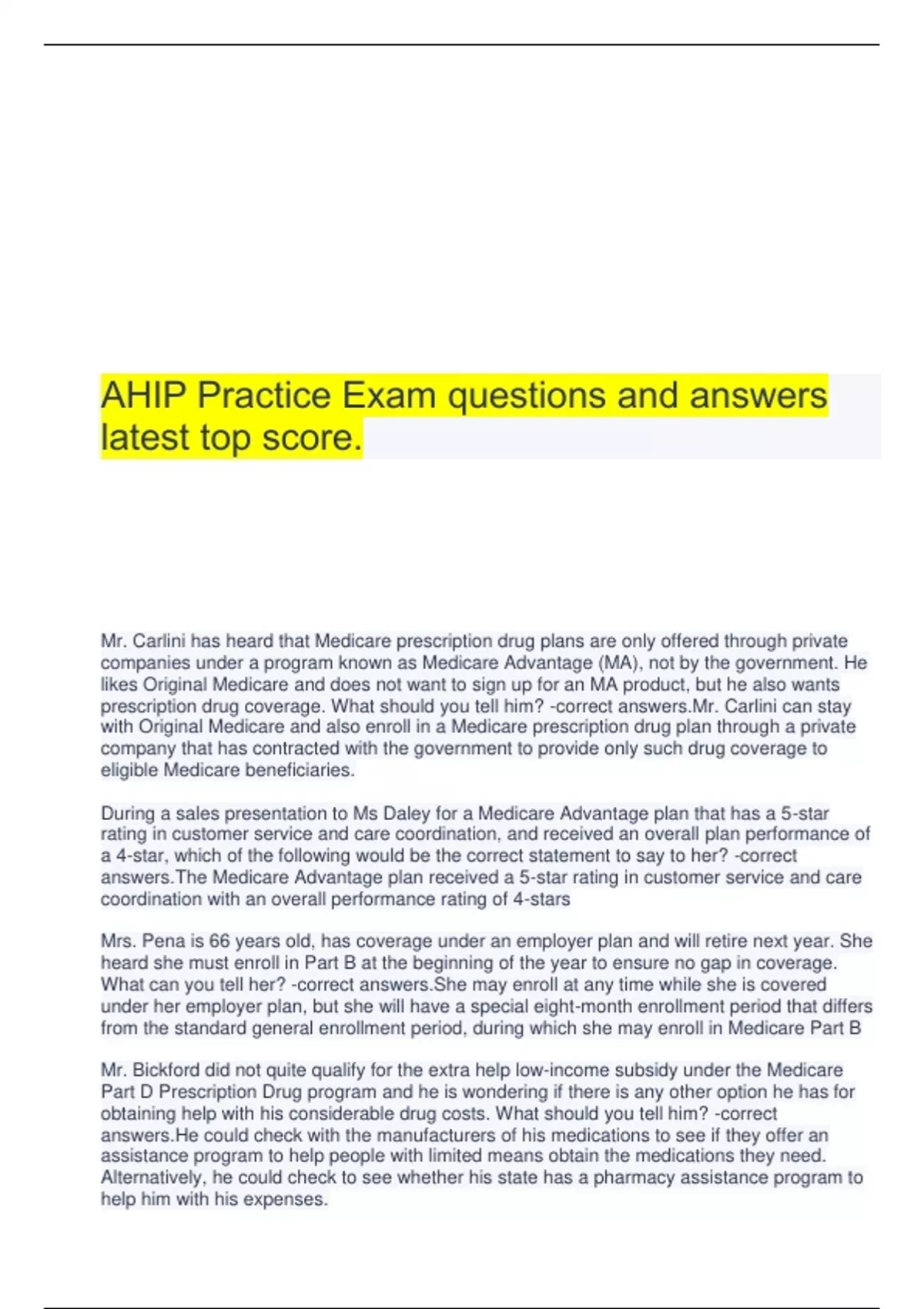 AHIP Practice Exam questions and answers latest top score. Mr. Carlini has heard that Medicare prescription drug plans are only offered through private companies under a program known as Medicare Advantage (MA), not by the government. He likes Original Medicare and does not want to sign up for an MA product, but he also wants prescription drug coverage. What should you tell him? -correct answers.Mr. Carlini can stay with Original Medicare and also enroll in a Medicare prescription drug plan through a private company that has contracted with the government to provide only such drug coverage to eligible Medicare beneficiaries. During a sales presentation to Ms Daley for a Medicare Advantage plan that has a 5-star rating in customer service and care coordination, and received an overall plan performance of a 4-star, which of the following would be the correct statement to say to her? -correct answers.The Medicare Advantage plan received a 5-star rating in customer service and care coordination with an overall performance rating of 4-stars Mrs. Pena is 66 years old, has coverage under an employer plan and will retire next year. She heard she must enroll in Part B at the beginning of the year to ensure no gap in coverage. What can you tell her? -correct answers.She may enroll at any time while she is covered under her employer plan, but she will have a special eight-month enrollment period that differs from the standard general enrollment period, during which she may enroll in Medicare Part B Mr. Bickford did not quite qualify for the extra help low-income subsidy under the Medicare Part D Prescription Drug program and he is wondering if there is any other option he has for obtaining help with his considerable drug costs. What should you tell him? -correct answers.He could check with the manufacturers of his medications to see if they offer an assistance program to help people with limited means obtain the medications they need. Alternatively, he could check to see whether his state has a pharmacy assistance program to help him with his expenses. Alice is a marketing representative employed by a health plan. Betty is a captive agent of a health plan who markets to multiple plans and sponsors. Carl is a captive agent who markets to only one plan/sponsor. Denise is an independent agent who markets to different types of groups. Edward is an independent agent who markets only to employer and union groups. CMS marketing representative compensation rules generally apply to: -correct answers.Betty and Denise, but not Alice (the employee) or Carl or Edward (to whom exceptions apply). Mrs. Valentino is currently enrolled in a Medicare Cost plan. This plan is no longer meeting her needs, but it is now mid-year and past the annual election period (AEP). What would you say to Mrs. Valentino regarding her options? -correct answers.Mrs. Valentino can submit a written request to Medicare to be disenrolled from the Cost plan and enroll in Original Medicare. When Myra first became eligible for Medicare, she enrolled in Original Medicare (Parts A and B). She is now 67 an
