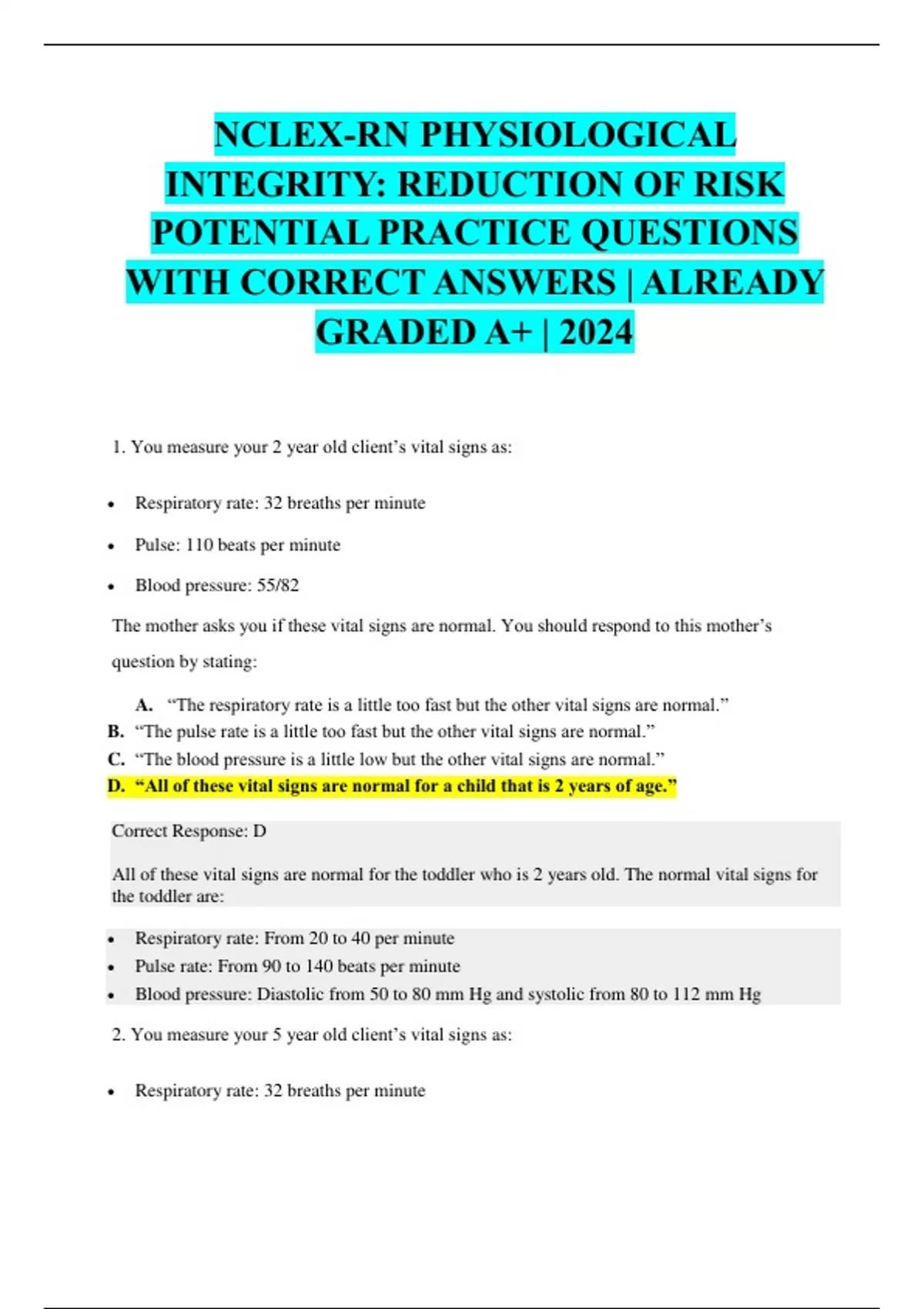NCLEX-RN PHYSIOLOGICAL INTEGRITY: REDUCTION OF RISK POTENTIAL PRACTICE QUESTIONS WITH CORRECT ANSWERS | ALREADY GRADED A+ | 2024 1. You measure your 2 year old client’s vital signs as: Respiratory rate: 32 breaths per minute Pulse: 110 beats per minute Blood pressure: 55/82 The mother asks you if these vital signs are normal. You should respond to this mother’s question by stating: A. “The respiratory rate is a little too fast but the other vital signs are normal.” B. “The pulse rate is a little too fast but the other vital signs are normal.” C. “The blood pressure is a little low but the other vital signs are normal.” D. “All of these vital signs are normal for a child that is 2 years of age.” Correct Response: D All of these vital signs are normal for the toddler who is 2 years old. The normal vital signs for the toddler are: Respiratory rate: From 20 to 40 per minute Pulse rate: From 90 to 140 beats per minute Blood pressure: Diastolic from 50 to 80 mm Hg and systolic from 80 to 112 mm Hg 2. You measure your 5 year old client’s vital signs as: Respiratory rate: 32 breaths per minut