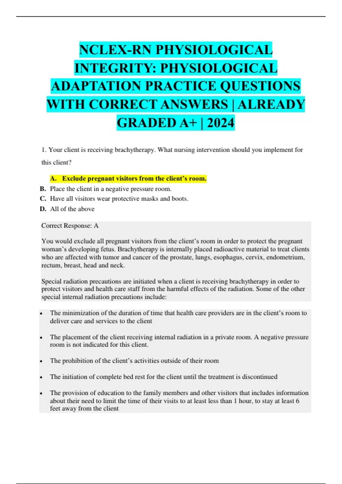 NCLEX-RN PHYSIOLOGICAL INTEGRITY: PHYSIOLOGICAL ADAPTATION PRACTICE QUESTIONS WITH CORRECT ANSWERS | ALREADY GRADED A+ | 2024 1. Your client is receiving brachytherapy. What nursing intervention should you implement for this client? A. Exclude pregnant visitors from the client’s room. B. Place the client in a negative pressure room. C. Have all visitors wear protective masks and boots. D. All of the above Correct Response: A You would exclude all pregnant visitors from the client’s room in order to protect the pregnant woman’s developing fetus. Brachytherapy is internally placed radioactive material to treat clients who are affected with tumor and cancer of the prostate, lungs, esophagus, cervix, endometrium, rectum, breast, head and neck. Special radiation precautions are initiated when a client is receiving brachytherapy in order to protect visitors and health care staff from the harmful effects of the radiation. Some of the other special internal radiation precautions include:  The minimization of the duration of time that health care providers are in the client’s room to deliver care and services to the client  The placement of the client receiving internal radiation in a private room. A negative pressure room is not indicated for this client.  The prohibition of the client’s activities outside of their room  The initiation of complete bed rest for the client until the treatment is discontinued  The provision of education to the family members and other visitors that includes information about their need to limit the time of their visits to at least less than 1 hour, to stay at least 6 feet away from the clien
