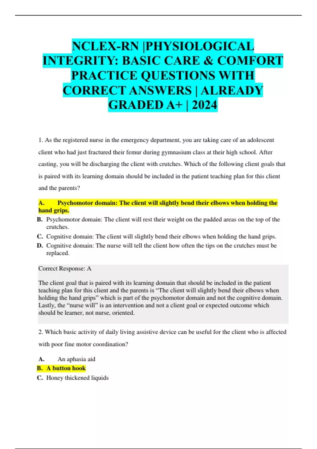 NCLEX-RN |PHYSIOLOGICAL INTEGRITY: BASIC CARE & COMFORT PRACTICE QUESTIONS WITH CORRECT ANSWERS | ALREADY GRADED A+ | 2024 1. As the registered nurse in the emergency department, you are taking care of an adolescent client who had just fractured their femur during gymnasium class at their high school. After casting, you will be discharging the client with crutches. Which of the following client goals that is paired with its learning domain should be included in the patient teaching plan for this client and the parents? A. Psychomotor domain: The client will slightly bend their elbows when holding the hand grips. B. Psychomotor domain: The client will rest their weight on the padded areas on the top of the crutches. C. Cognitive domain: The client will slightly bend their elbows when holding the hand grips. D. Cognitive domain: The nurse will tell the client how often the tips on the crutches must be replaced. Correct Response: A The client goal that is paired with its learning domain that should be included in the patient teaching plan for this client and the parents is “The client will slightly bend their elbows when holding the hand grips” which is part of the psychomotor domain and not the cognitive domain. Lastly, the “nurse will” is an intervention and not a client goal or expected outcome which should be learner, not nurse, oriented. 2. Which basic activity of daily living assistive device can be useful for the client who is affected with poor fine motor coordination? A. An aphasia aid B. A button hook C. Honey thickened liquid