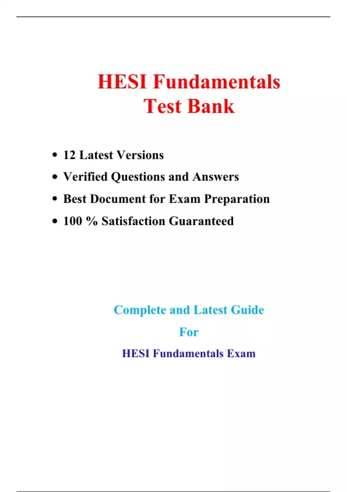 HESI Fundamentals Test Bank • 12 Latest Versions • Verified Questions and Answers • Best Document for Exam Preparation • 100 % Satisfaction Guaranteed Complete and Latest Guide For HESI Fundamentals Exam HESI FUNDAMENTALS 1. A policy requiring the removal of acrylic nails by all nursing personnel was implemented 6 months ago. Which assessment measure best determines if the intended outcome of the policy is being achieved. a. Number of staff induced injury b. Client satisfaction survey c. Health care-associated infectionrate. d. Rate of needle-stick injuries bynurse. 2. The nurse is preparing to assist a newly admitted client with personal hygiene measures. The client...the client’s gag reflex. Which action should the nurse include? A. Offer smalls sips of water through astraw B. Place tongue blade on back half oftongue C. Use a penlight to observe back of oral cavity D. Auscultate breath sounds after client swallows 3. The nurse explains to an older adult male the procedure for collecting a 24-hour urine specimen for creatinine clearance. A. Assess the client for confusion and reteach the procedure B. Check the urine for color and texture C. Empty the urinal contents into the 24-hour collection container D. Discard the contents of the urinal 4. A 54-year-old male client and his wife were informed this morning that he has terminal cancer. Which nursing intervention is likely to be most A. Ask her how she would like to participate in the client’s care B. Provide the wife with information about hospice C. Encourage the wife to visit after painful treatments are completed D. Refer her to support group for family members of those dying of cancer 5. A client who has a body mass index (BMI) of 30 is requesting information on the initial approach to a weight loss plan. Which action should the nurse recommend? A. Plan low carbohydrate and high proteinmeals B. Engage in strenuous activity for an hourdaily C. Keep a record of food and drinks consumed daily D. Participated in a group exercise class 3 times a week 6. The nurse assesses a client who has a nasal cannula delivering oxygen at 2 L/min. To assess for skin damage related to the cannula, which areas should the nurse observe? A. Tops of the ear B. Bridge of the nose C. Around the nostrils D. Over the cheeks E. Across the forehead 7. The nurse observes an unlicensed assistive personnel (UAP) who is providing a total bed bath for a confused and lethargic client. The UAP is soaking the client’s foot in a basin of warm water placed on the bed. What action should the nurse take? a. Remove the basin of water from the client’s bed immediately b. Remind the UAP to dry between the client’s toes completely c. Advise the UAP that this procedure is damaging to the skin d. Add skin cream to the basin of water while the foot is soaking 8. The nurse in the emergency department observes a colleague viewing the electronic health record (EHR) of a client who holds an elected position in the community. The client is not a part of the colleague’s assignment. Which action should the nurseimplement? a. Communicate the colleague’s actions to the unit charge nurse b. Send an email to facility administration reporting the action c. Write an anonymous complaint to a professional website d. Post a comment about the action on a staff discussion board 9. At 0100 on a male client’s second postoperative night, the client states he is unstable to sleep and plans to read until feeling sleepy. What action should the nurse implement? a. Leave the room and close the door to the client’s room b. Assess the appearance of the client’s surgical dressing c. Bring the client a prescribed PRN sedative-hypnotic d. Discuss symptoms of sleep deprivation with the client 10. The nursing staff in the cardiovascular intensive care unit are creating a continuous quality improvement project on social media that addresses coronary artery disease (CAD). Which action should the nurse implement to protect client privacy? a. Remove identifying information of the clients who participated b. Recall that authored content may be legally discoverable c. Share material from credible, peer reviewed sources only d. Respect all copyright laws when adding website content
