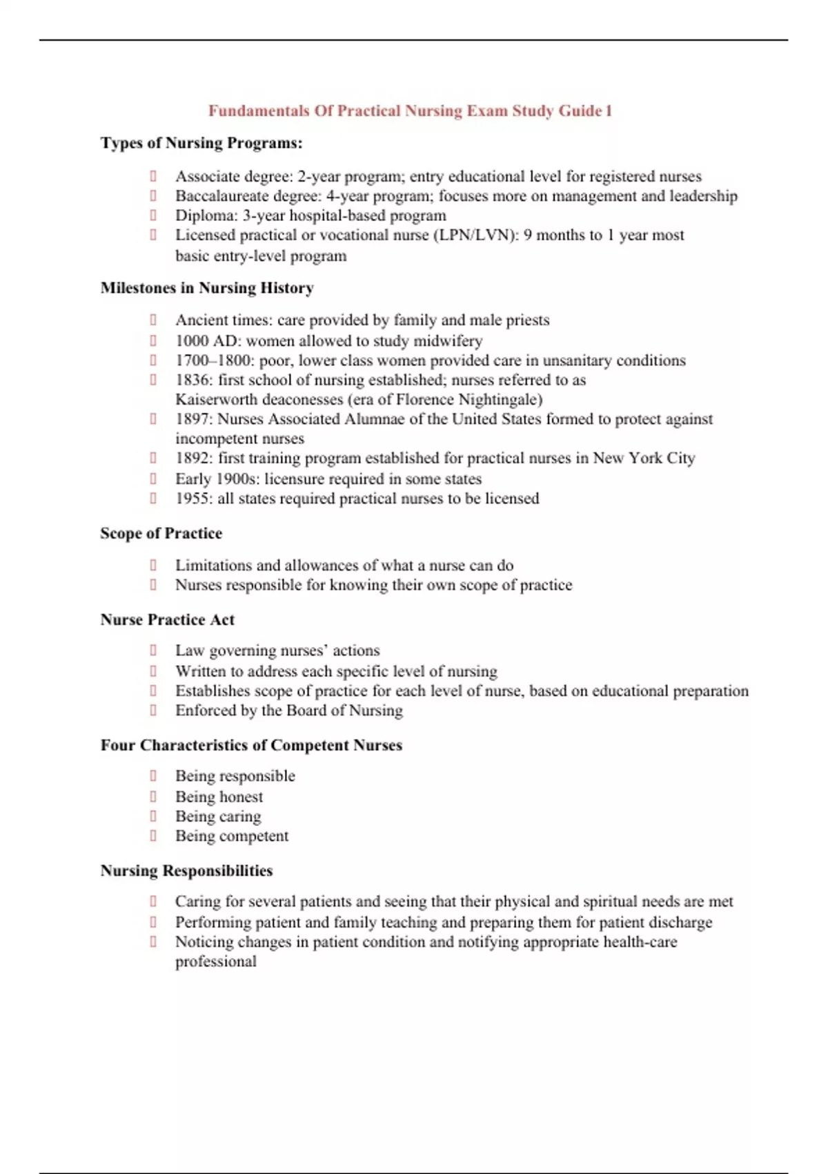 Fundamentals Of Practical Nursing Exam Study Guide 1 Types of Nursing Programs: ◆ Associate degree: 2-year program; entry educational level for registered nurses ◆ Baccalaureate degree: 4-year program; focuses more on management and leadership ◆ Diploma: 3-year hospital-based program ◆ Licensed practical or vocational nurse (LPN/LVN): 9 months to 1 year most basic entry-level program Milestones in Nursing History ◆ Ancient times: care provided by family and male priests ◆ 1000 AD: women allowed to study midwifery ◆ 1700–1800: poor, lower class women provided care in unsanitary conditions ◆ 1836: first school of nursing established; nurses referred to as Kaiserworth deaconesses (era of Florence Nightingale) ◆ 1897: Nurses Associated Alumnae of the United States formed to protect against incompetent nurses ◆ 1892: first training program established for practical nurses in New York City ◆ Early 1900s: licensure required in some states ◆ 1955: all states required practical nurses to be licensed Scope of Practice ◆ Limitations and allowances of what a nurse can do ◆ Nurses responsible for knowing their own scope of practice Nurse Practice Act ◆ Law governing nurses’ actions ◆ Written to address each specific level of nursing ◆ Establishes scope of practice for each level of nurse, based on educational preparation ◆ Enforced by the Board of Nursing Four Characteristics of Competent Nurses ◆ Being responsible ◆ Being honest ◆ Being caring ◆ Being competent Nursing Responsibilities ◆ Caring for several patients and seeing that their physical and spiritual needs are met ◆ Performing patient and family teaching and preparing them for patient discharge ◆ Noticing changes in patient condition and notifying appropriate health-care professional ◆ Communicates well ◆ Takes responsibility for own actions ◆ Sees self as a professional and acts and dresses accordingly Nursing Is Both an Art and a Science ◆ Art of nursing: The caring, creativity, communication, and compassion necessary to connect with patients in a meaningful way ◆ Science of nursing: The analysis and integration of data, the decision-making process, and the technical monitoring of patients Examples of Unprofessional Conduct ◆ Use of drugs or alcohol in ways that endanger a patient ◆ Diversion of drugs from patient to personal use ◆ Failure to supervise nursing assistants ◆ Failure to provide adequate care for patients ◆ Criminal conduct Managed Care: “A system of health-care delivery aimed at managing the cost and quality of access to medical care” Health-Care Team ◆ Medical staff ◆ Nursing staff ◆ Therapy staff ◆ Laboratory staff ◆ Radiology staff ◆ Ancillary staff (House Keeping) Types of Inpatient Care Facilities ◆ Acute medical or mental health care hospital ◆ Skilled nursing facility in a nursing home or hospital ◆ Long-term acute care hospital ◆ Rehabilitation facility Types of Outpatient Facilities ◆ Hospital outpatient department ◆ Outpatient mental health services ◆ Cardiac rehabilitation ◆ Pulmonary rehabilitation ◆ Health departments ◆ Physician’s office ◆ Home health care