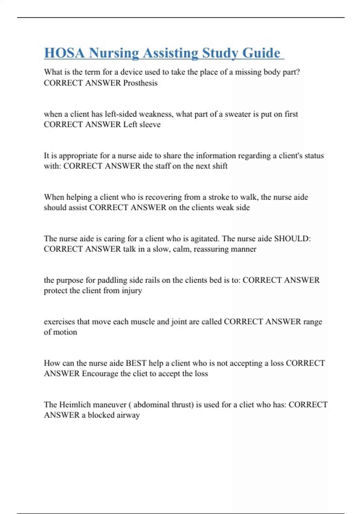 What is the term for a device used to take the place of a missing body part? CORRECT ANSWER Prosthesis when a client has left-sided weakness, what part of a sweater is put on first CORRECT ANSWER Left sleeve It is appropriate for a nurse aide to share the information regarding a client's status with: CORRECT ANSWER the staff on the next shift When helping a client who is recovering from a stroke to walk, the nurse aide should assist CORRECT ANSWER on the clients weak side The nurse aide is caring for a client who is agitated. The nurse aide SHOULD: CORRECT ANSWER talk in a slow, calm, reassuring manner the purpose for paddling side rails on the clients bed is to: CORRECT ANSWER protect the client from injury exercises that move each muscle and joint are called CORRECT ANSWER range of motion