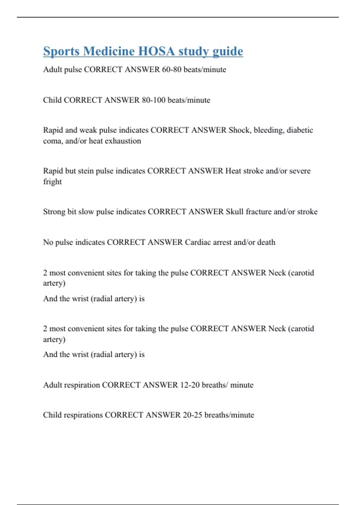 Adult pulse CORRECT ANSWER 60-80 beats/minute Child CORRECT ANSWER 80-100 beats/minute Rapid and weak pulse indicates CORRECT ANSWER Shock, bleeding, diabetic coma, and/or heat exhaustion Rapid but stein pulse indicates CORRECT ANSWER Heat stroke and/or severe fright Strong bit slow pulse indicates CORRECT ANSWER Skull fracture and/or stroke No pulse indicates CORRECT ANSWER Cardiac arrest and/or death 2 most convenient sites for taking the pulse CORRECT ANSWER Neck (carotid artery) And the wrist (radial artery) is 2 most convenient sites for taking the pulse CORRECT ANSWER Neck (carotid artery) And the wrist (radial artery) is Adult respiration CORRECT ANSWER 12-20 breaths/ minute