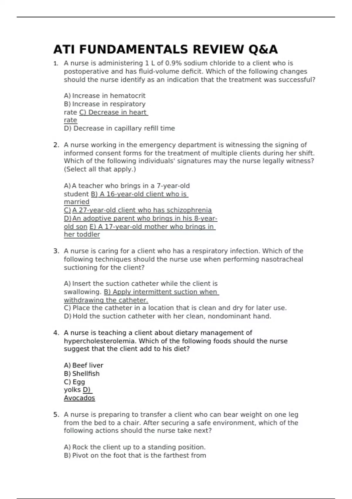 1. A nurse is administering 1 L of 0.9% sodium chloride to a client who is postoperative and has fluid-volume deficit. Which of the following changes should the nurse identify as an indication that the treatment was successful? A) Increase in hematocrit B) Increase in respiratory rate C) Decrease in heart rate D) Decrease in capillary refill time 2. A nurse working in the emergency department is witnessing the signing of informed consent forms for the treatment of multiple clients during her shift. Which of the following individuals' signatures may the nurse legally witness? (Select all that apply.) A) A teacher who brings in a 7-year-old student B) A 16-year-old client who is married C) A 27-year-old client who has schizophrenia D) An adoptive parent who brings in his 8-year-old son E) A 17-year-old mother who brings in her toddler 3. A nurse is caring for a client who has a respiratory infection. Which of the following techniques should the nurse use when performing nasotracheal suctioning for the client? A) Insert the suction catheter while the client is swallowing. B) Apply intermittent suction when withdrawing the catheter. C) Place the catheter in a location that is clean and dry for later use. D) Hold the suction catheter with her clean, nondominant hand. 4. A nurse is teaching a client about dietary management of hypercholesterolemia. Which of the following foods should the nurse suggest that the client add to his diet? A) Beef liver B) Shellfish C) Egg yolks D) Avocados 5. A nurse is preparing to transfer a client who can bear weight on one leg from the bed to a chair. After securing a safe environment, which of the following actions should the nurse take next? A) Rock the client up to a standing position. B) Pivot on the foot that is the farthest from the chair. C) Assess the client for orthostatic hypotension. D) Apply a gait belt to the client.