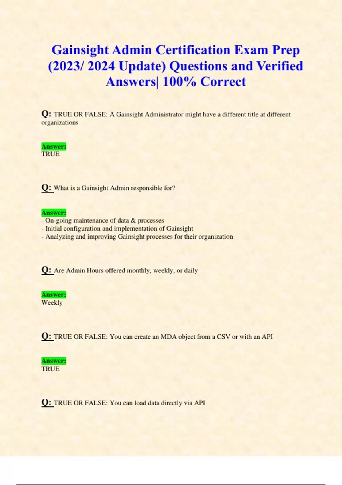 Gainsight Admin Certification Exam Prep (2023/ 2024 Update) Questions and Verified Answers| 100% Correct Q: TRUE OR FALSE: A Gainsight Administrator might have a different title at different organizations Answer: TRUE Q: What is a Gainsight Admin responsible for? Answer: - On-going maintenance of data & processes - Initial configuration and implementation of Gainsight - Analyzing and improving Gainsight processes for their organization Q: Are Admin Hours offered monthly, weekly, or daily Answer: Weekly Q: TRUE OR FALSE: You can create an MDA object from a CSV or with an API Answer: TRUE Q: TRUE OR FALSE: You can load data directly via API Answer: FALSE Q: You can load data via: Answer: - Rules Engine - Transfer data in and out of S3 buckets Q: What are Key Identifiers? Answer: Key Identifiers is a checkbox in data management that ensure that information is appropriately aggregated/mapped Q: How many records can a low volume object store? Answer: Up to 5000 Low Volume Data Objects are used for data that needs to be edited frequently. There are advantages to using Low Volume objects such as the ability to edit data in the object from more locations in Gainsight, and the ability to load data into the object using Custom Object APIs. Q: How many records can a High Volume object store? Answer: Up to 1 million This object type is recommended for storing huge volumes of data, like usage data. Q: From an object's Data Operations tab, you can.. Answer: - Filter records based on selected criteria - Delete records - Configure the displayed fields for the records list You CANNOT build reports based off objects from this tab Q: TRUE OR FALSE: A field's data type can be changed after an object is created Answer: FALSE Q: MDA Field Data Types- Date & Time. Is there a difference between Date and DateTime? Answer: Yes! Remember that Date and DateTime are different. Using date rather the date time simplifies the use of the field in GS, so use date when you can Q: What are the three MDA Object types? Answer: System, Standard, and Custom Q: What is a Standard Object in the MDA? Answer: Objects created by Gainsight and include Company, User, Person, Relationship, and Relationship Type