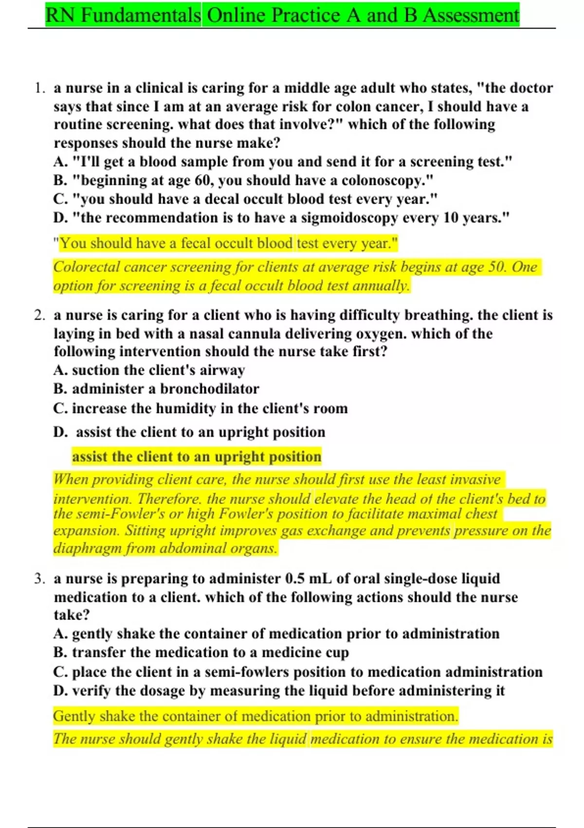 1. a nurse in a clinical is caring for a middle age adult who states, "the doctor says that since I am at an average risk for colon cancer, I should have a routine screening. what does that involve?" which of the following responses should the nurse make? A. "I'll get a blood sample from you and send it for a screening test." B. "beginning at age 60, you should have a colonoscopy." C. "you should have a decal occult blood test every year." D. "the recommendation is to have a sigmoidoscopy every 10 years." "You should have a fecal occult blood test every year." option for screening is a fecal occult blood test annually. 2. a nurse is caring for a client who is having difficulty breathing. the client is laying in bed with a nasal cannula delivering oxygen. which of the following intervention should the nurse take first? A. suction the client's airway B. administer a bronchodilator C. increase the humidity in the client's room D. assist the client to an upright position assist the client to an upright position intervention. Therefore, the nurse should elevate the head of the client's bed to expansion. Sitting upright improves gas exchange and prevents pressure on the diaphragm from abdominal organs. 3. a nurse is preparing to administer 0.5 mL of oral single-dose liquid medication to a client. which of the following actions should the nurse take? A. gently shake the container of medication prior to administration B. transfer the medication to a medicine cup C. place the client in a semi-fowlers position to medication administration D. verify the dosage by measuring the liquid before administering it Gently shake the container of medication prior to administration. The nurse should gently shake the liquid medication to ensure the medication is mixed. 4. a nurse is planning care to improve self-feeding for a client who has vision loss. which of the following interventions should the nurse include in the plan of care? A. tell the client which food she should eat first B. provide small-handle utensils for the client C. thicken liquids on the client's tray D. use a clock pattern to describe food on the client's plate Use a clock pattern to describe food on the client's plate. Use a clock pattern to describe food on the client's plate.MY ANSWERDescribing the location of the food on the plate by using a clock pattern allows the client to have greater independence during meals. 5. a nurse is teaching an older adult client who is at risk for osteoporosis about beginning a program of regular physical activity. which of the following types of activity should the nurse recommend? A. walking briskly B. riding a bicycle C. performing isometric exercises D. engaging in high-impact aerobics walking briskly Weight-bearing exercises are