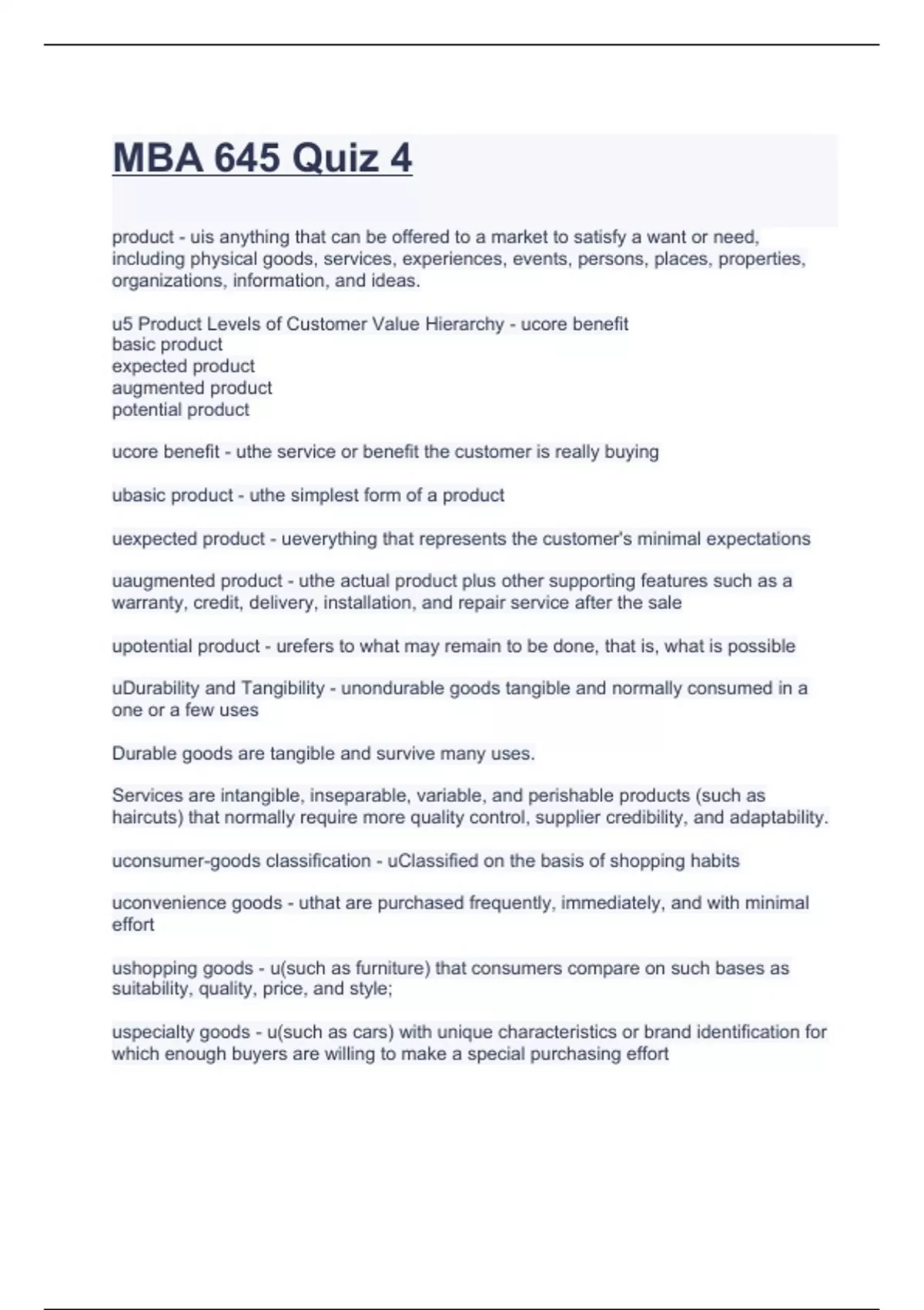 product - uis anything that can be offered to a market to satisfy a want or need, including physical goods, services, experiences, events, persons, places, properties, organizations, information, and ideas. u5 Product Levels of Customer Value Hierarchy - ucore benefit basic product expected product augmented product potential product ucore benefit - uthe service or benefit the customer is really buying ubasic product - uthe simplest form of a product uexpected product - ueverything that represents the customer's minimal expectations uaugmented product - uthe actual product plus other supporting features such as a warranty, credit, delivery, installation, and repair service after the sale upotential product - urefers to what may remain to be done, that is, what is possible uDurability and Tangibility - unondurable goods tangible and normally consumed in a one or a few uses Durable goods are tangible and survive many uses. Services are intangible, inseparable, variable, and perishable products (such as haircuts) that normally require more quality control, supplier credibility, and adaptability. uconsumer-goods classification - uClassified on the basis of shopping habits uconvenience goods - uthat are purchased frequently, immediately, and with minimal effort ushopping goods - u(such as furniture) that consumers compare on such bases as suitability, quality, price, and style; uspecialty goods - u(such as cars) with unique characteristics or brand identification for which enough buyers are willing to make a special purchasing effort uunsought goods - u(such as smoke detectors) that the consumer does not know about or normally think of buying. uIndustrial-Goods Classification - umaterials and parts, capital items, supplies and business services ucapital items - uare long-lasting goods that facilitate developing or managing the finished product, including installations (factories) and equipment (tools). Supplies and business services are short-term goods and services that facilitate developing or managing the finished product. uMeans of Differentiation - uform, features, performance quality, conformance quality, durability, reliability, repairability, style, and customization uForm - urefers to the size, shape, or physical structure of a product. For example, aspirin can be differentiated by dosage size, shape, color, coating, or action time. uFeatures - uMost products can be offered with varying features that supplement their basic function. A company can identify and select new features by surveying recent buyers and then calculating customer value versus company cost for each potential feature. uPerformance Quality - uis the level at which the product's primary characteristics operate. Firms should design a performance level appropriate to the target market and competition (not necessarily the highest level possible) and manage performance quality through time. uConformance quality - uthe degree to which all produced units are identical and meet promised specifications. A product with low conformance quality will disappoint some buyers. uDurability - ua measure of the product's expected operating life under natural or stressful conditions, is a valued attribute for durable goods. The extra price for durability must not be excessive, and the product must not be subject to rapid technological obsolescence. uReliability - ua measure of the probability that a product will not malfunction or fail within a specified period. uRepairability - umeasures the ease of fixing a product when it malfunctions or fails. Ideal repairability would exist if users could fix the product themselves with little cost in money or time. ustyle - udescribes the product's look and feel to the buyer and creates distinctiveness that is hard to copy, although strong style does not always mean high performance. Style plays a key role in the marketing of many brands, such as Apple's tablets. ucustomization - uallow firms to be highly relevant and differentiating by finding out exactly what a person wants and delivering on that. Customized products include M&M's with specialized messages and Burberry coats with customer-selected fabric and accessories.7 u6 types of service differentiation - u1. Ordering ease. How easy is it for the customer to place an order with the company? 2. Delivery. How well is the product or service brought to the customer, including speed, accuracy, and care throughout the process? 3. Installation. How is the product made operational in its planned location? This is a true selling point for buyers of complex products like heavy equipment. 4. Customer training. How does the supplier teach a customer's employees to use new equipment properly and efficiently? 5. Customer consulting. What data, information systems, and advice services can companies sell to buyers? 6. Maintenance and repair. How can companies help customers keep purchased products in good working order? These services are critical in business-to-business settings and with luxury products. uproduct system - uis a group of diverse but related items that function in a compatible manner. uproduct mix (also called product assortment) - uis the set of all products and items a particular firm offers for sale. uline filling - ua firm lengthens its product line by adding more items within the present range. uline stretching - ua company lengthens its product line beyond its current range uproduct mix pricing - uthe firm searches for a set of prices that maximizes profits on the total mix. u6 product mix pricing situations - u1. Product line pricing. The seller introduces price steps within a product line and strives to establish perceived quality differences that justify the price differences. 2. Optional-feature pricing. The seller offers optional products, features, and services with the main product, the way automakers offer different trim levels. The challenge is which options to include in the standard price and which to offer separately. 3. 