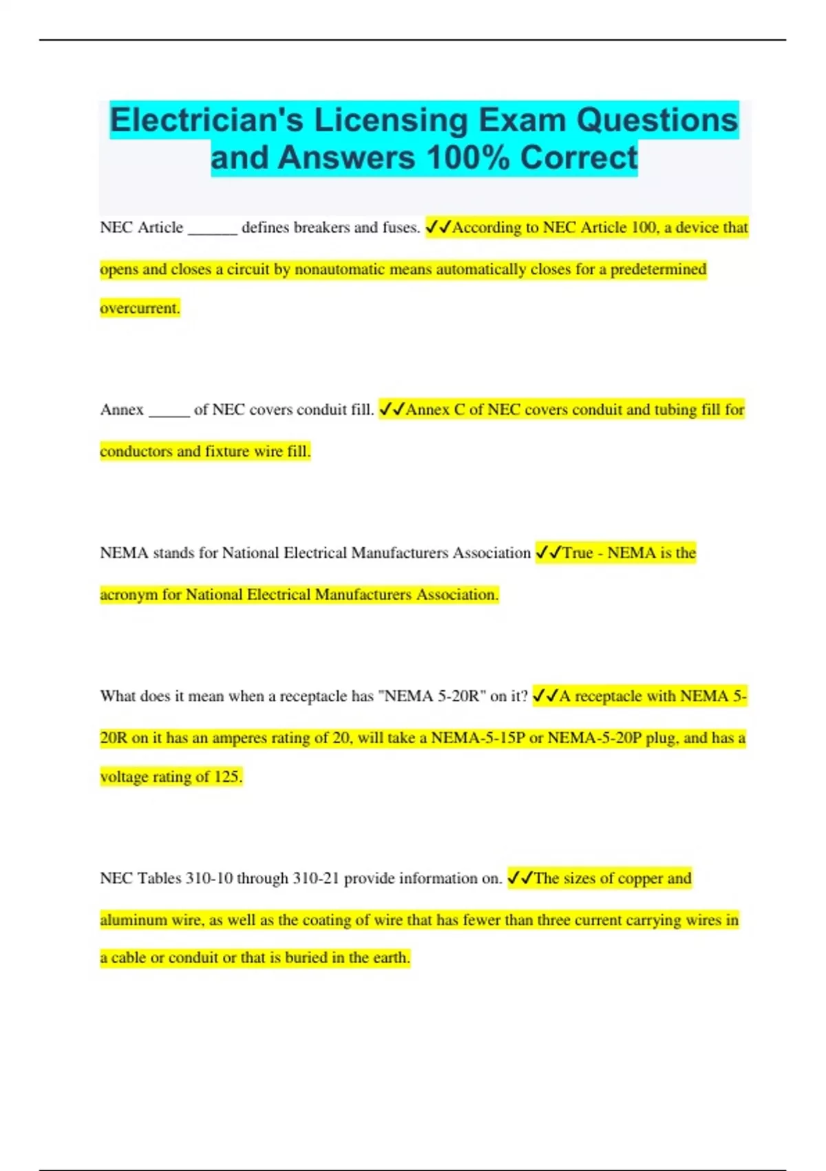 Electrician's Licensing Exam Questions and Answers 100% Correct NEC Article ______ defines breakers and fuses. According to NEC Article 100, a device that opens and closes a circuit by nonautomatic means automatically closes for a predetermined overcurrent. Annex _____ of NEC covers conduit fill. Annex C of NEC covers conduit and tubing fill for conductors and fixture wire fill. NEMA stands for National Electrical Manufacturers Association True - NEMA is the acronym for National Electrical Manufacturers Association. What does it mean when a receptacle has "NEMA 5-20R" on it? A receptacle with NEMA 5-20R on it has an amperes rating of 20, will take a NEMA-5-15P or NEMA-5-20P plug, and has a voltage rating of 125. NEC Tables 310-10 through 310-21 provide information on. The sizes of copper and aluminum wire, as well as the coating of wire that has fewer than three current carrying wires in a cable or conduit or that is buried in the earth. Which NEC tables(s) cover(s) the fill of metal boxes? The fill of metal boxes appears in NEC Tables 314.6 A and B. NEC Article _____ address EMT. NEC Article 358 covers EMT. Which NEC articles cover the installation requirements for RMC, IMC, and EMT? NEC Articles 342, 344, and 358 outline the installation requirements of RMC, IMC, and EMT. IN NEC 2008, what does Table 370.6A cover? Shows in two columns (milimeters and inches), how many wires in trade size you can place in a box. What NEC table would you go to to find trade size of conduit and raceway size? Chapter 9, Table 4 outlines trade size of conduit as well as raceway size. NEC Articles _____ and _____ covers metallic and non-metallic raceways in buildings. NEC Article 386 covers metallic or metal raceway; NEC Article 388 covers PVC pipe. The Panel Board requirements for Application in Construction appear in NEC Article? NEC Article 408 covers panel board applications. The smaller kitchen counter requiring a receptacle is _____ inches. A 12in. counter requires a receptacle because it holds small appliances. What new code is needed for protection in all habitable spaces? According to new codes, ARC fault protection is needed many additional parts of the house. A 12-foot hallway requires one receptacle to meet code. (True or False) True, One is required, Two are suggested. NEC Article 100 is dedicated to? Definitions The main ground on a service is a(n) _____. Ground Rod What